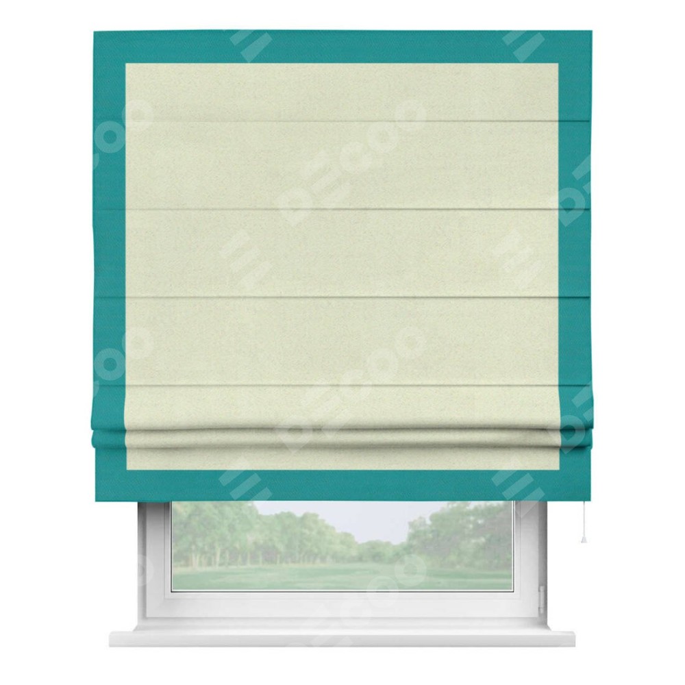 Римская штора производителя «Cortin», используется для проёма, пошита из ткани блэкаут однотонный сливочный, артикул ткани 6668−02. Отделка шторы кантом «Чесс», ткань для канта используется из блэкаута однотонного разной расцветки на выбор. Имеет универсальный механизм и подходит для монтажа: на потолок, на стену и в нишу.