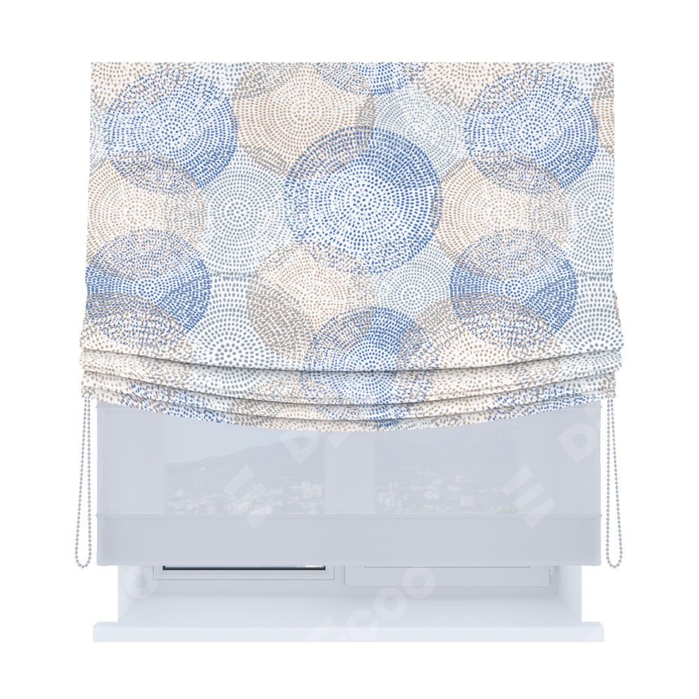 Римская штора день-ночь производителя «Cortin», используется для проёма, пошита из двух полотен, с лицевой блэкаут с нанесением сублимационной печати «Абстрактные круги», вторая ткань тюль (по стандарту комплектуется тюль белого цвета артикул V-01). Имеет универсальный механизм и подходит для монтажа: на потолок, на стену и в нишу. Удобное управление каждой шторой отдельно.
