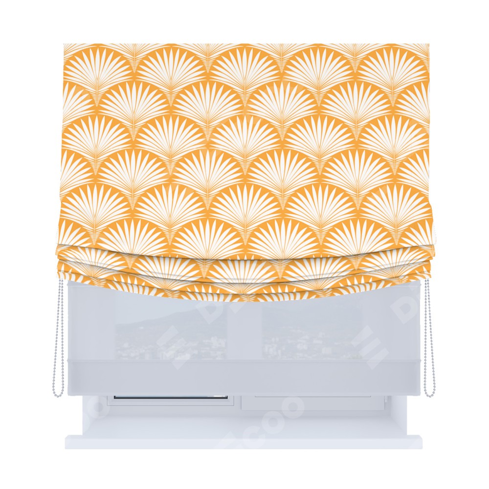 Римская штора день-ночь производителя «Cortin», используется для проёма, пошита из двух полотен, с лицевой блэкаут с нанесением сублимационной печати «Арт-деко листья желтый», вторая ткань тюль (по стандарту комплектуется тюль белого цвета артикул V-01). Имеет универсальный механизм и подходит для монтажа: на потолок, на стену и в нишу. Удобное управление каждой шторой отдельно.