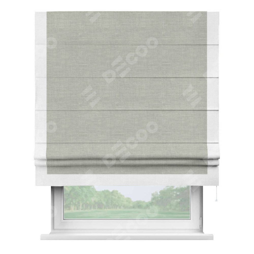 Римская штора производителя «Cortin», используется для проёма, пошита из ткани лён серый, артикул 7440. Отделка шторы кантом «Виктория», ткань для канта используется из льна разной расцветки на выбор. Имеет универсальный механизм и подходит для монтажа: на потолок, на стену и в нишу.