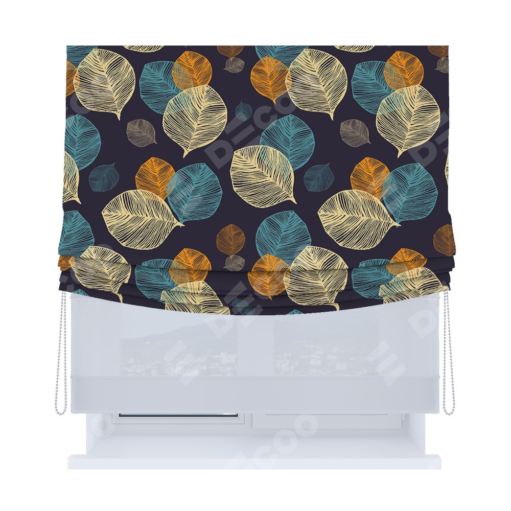 Римская штора день-ночь производителя «Cortin», используется для проёма, пошита из двух полотен, с лицевой блэкаут с нанесением сублимационной печати «Листья в ночи», вторая ткань тюль (по стандарту комплектуется тюль белого цвета артикул V-01). Имеет универсальный механизм и подходит для монтажа: на потолок, на стену и в нишу. Удобное управление каждой шторой отдельно.