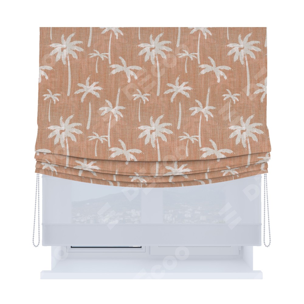 Римская штора день-ночь производителя «Cortin», используется для проёма, пошита из двух полотен, с лицевой блэкаут с нанесением сублимационной печати «Пальмы на закате», вторая ткань тюль (по стандарту комплектуется тюль белого цвета артикул V-01). Имеет универсальный механизм и подходит для монтажа: на потолок, на стену и в нишу. Удобное управление каждой шторой отдельно.
