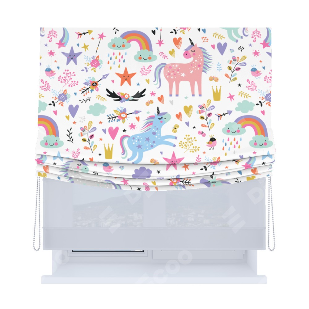 Римская штора «Кортин», день-ночь с мягкими складками, «Радужные единороги»