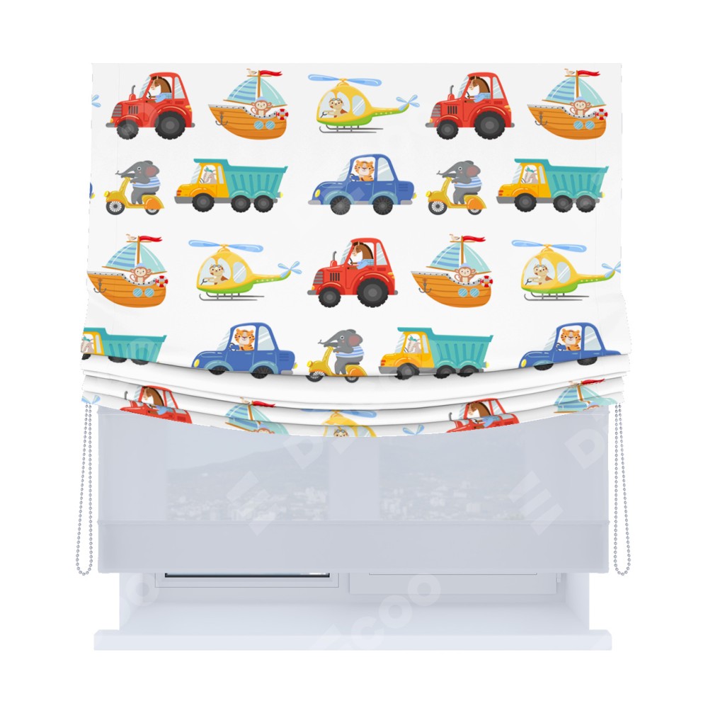Римская штора день-ночь производителя «Cortin», используется для проёма, пошита из двух полотен, с лицевой блэкаут с нанесением сублимационной печати «Увлекательная поездка», вторая ткань тюль (по стандарту комплектуется тюль белого цвета артикул V-01). Имеет универсальный механизм и подходит для монтажа: на потолок, на стену и в нишу. Удобное управление каждой шторой отдельно.