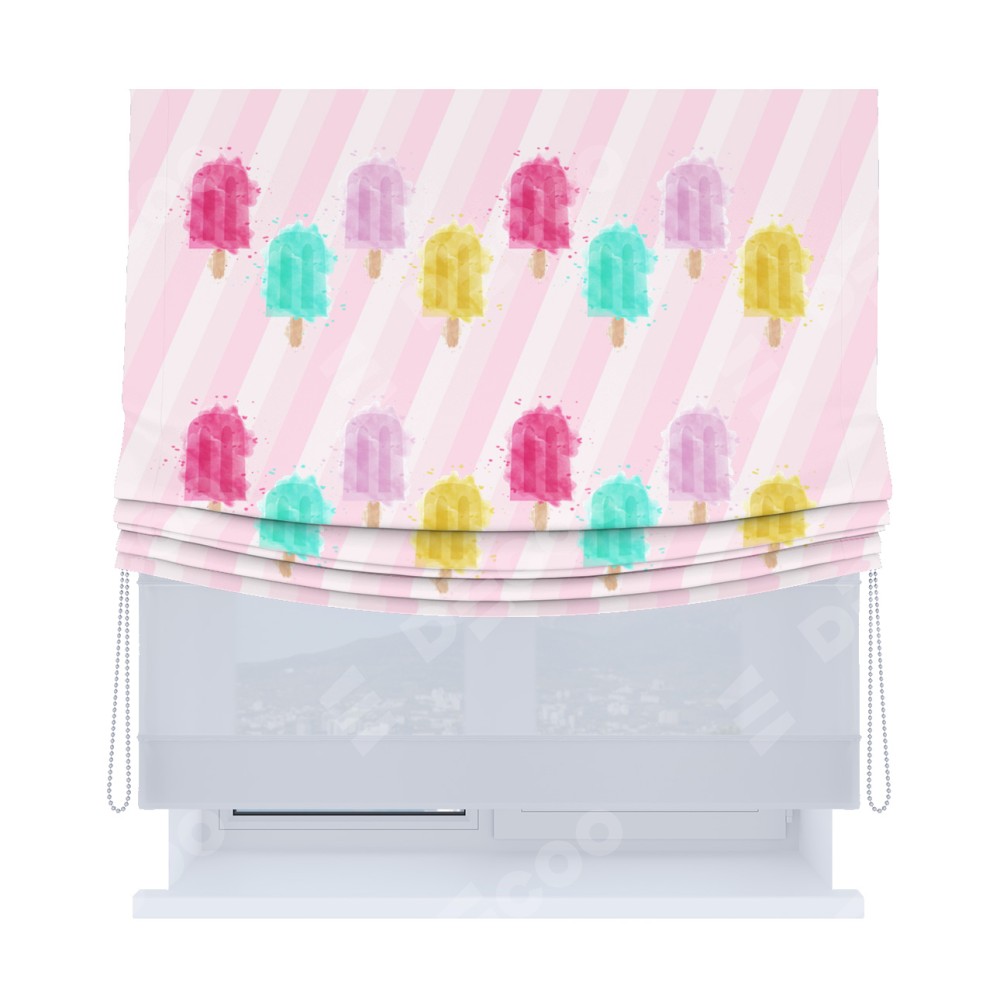 Римская штора день-ночь производителя «Cortin», используется для проёма, пошита из двух полотен, с лицевой блэкаут с нанесением сублимационной печати «Фруктовое мороженое», вторая ткань тюль (по стандарту комплектуется тюль белого цвета артикул V-01). Имеет универсальный механизм и подходит для монтажа: на потолок, на стену и в нишу. Удобное управление каждой шторой отдельно.