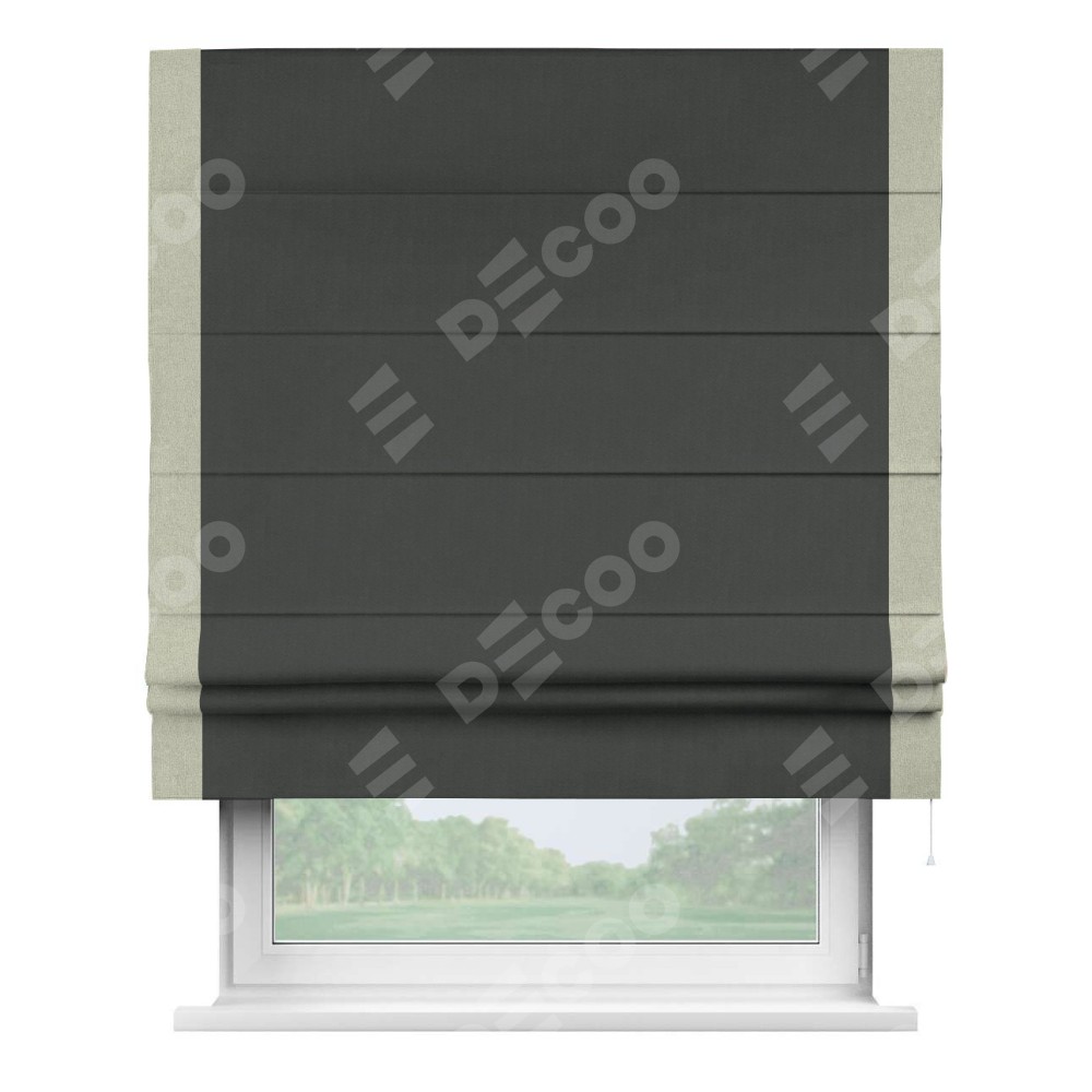 Римская штора производителя «Cortin», используется для проёма, пошита из ткани лён блэкаут графит, артикул 69448. Отделка шторы кантом «Стрим Дуо», ткань для канта используется из льна разной расцветки на выбор. Имеет универсальный механизм и подходит для монтажа: на потолок, на стену и в нишу.