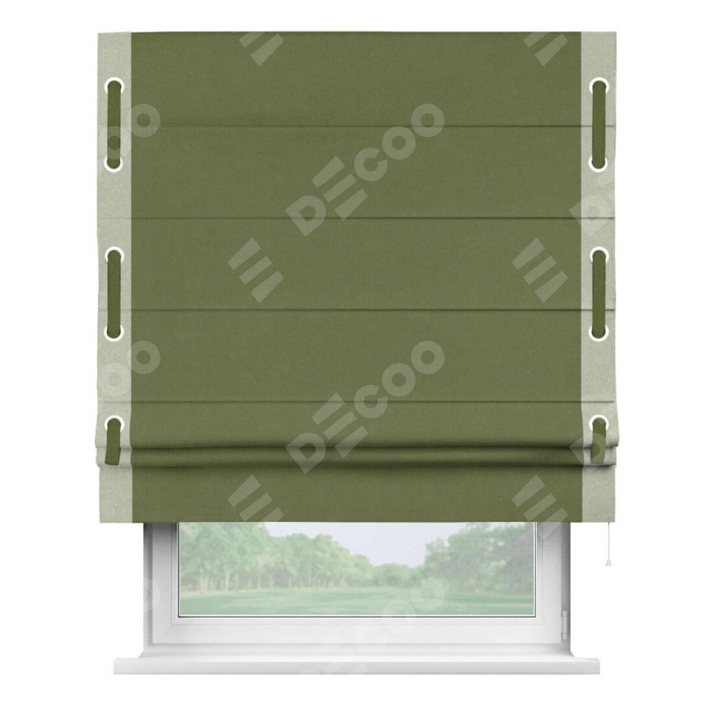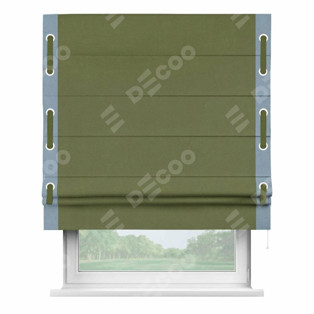 Римская штора производителя «Cortin», используется для проёма, пошита из ткани лён блэкаут оливковый, артикул 69516. Отделка шторы кантом «Стрим Дуо» на кантах расположены люверсы с пояском, ткань для канта используется из льна разной расцветки на выбор. Ткань для пояска обычно используется из основной ткани шторы, а так же можно сделать из любой расцветки по желанию. Имеет универсальный механизм и подходит для монтажа: на потолок, на стену и в нишу.