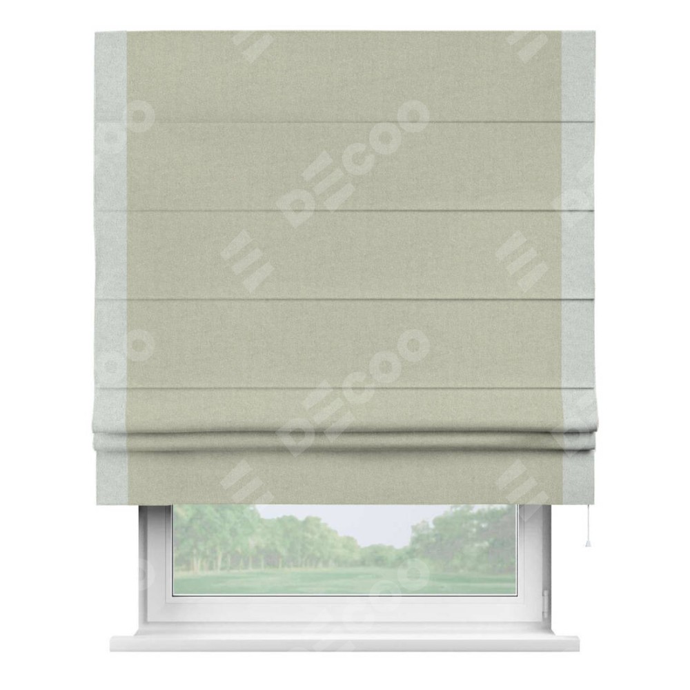 Римская штора производителя «Cortin», используется для проёма, пошита из ткани лён блэкаут серо-бежевый, артикул 69450. Отделка шторы кантом «Стрим Дуо», ткань для канта используется из льна разной расцветки на выбор. Имеет универсальный механизм и подходит для монтажа: на потолок, на стену и в нишу.