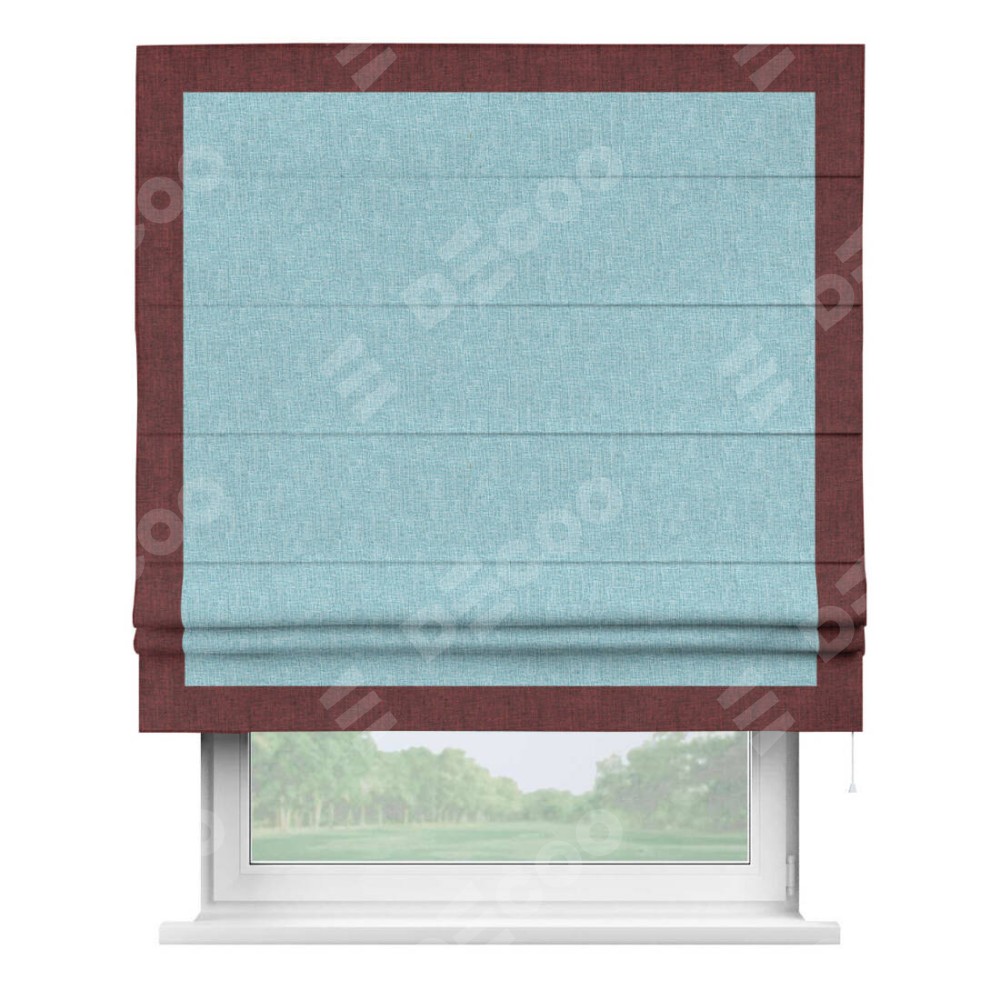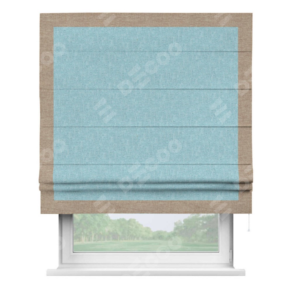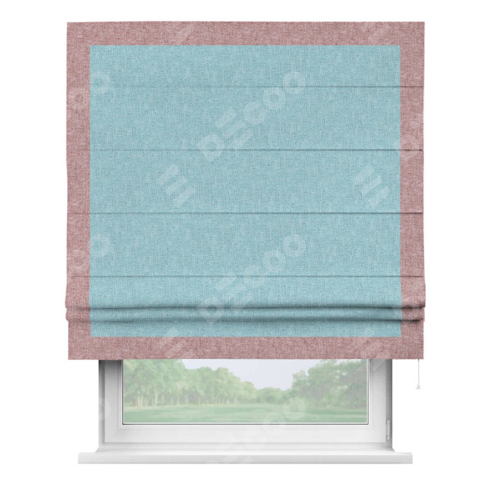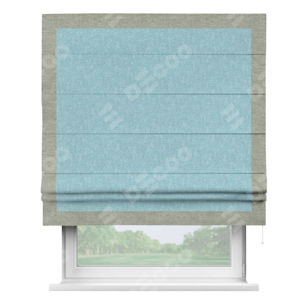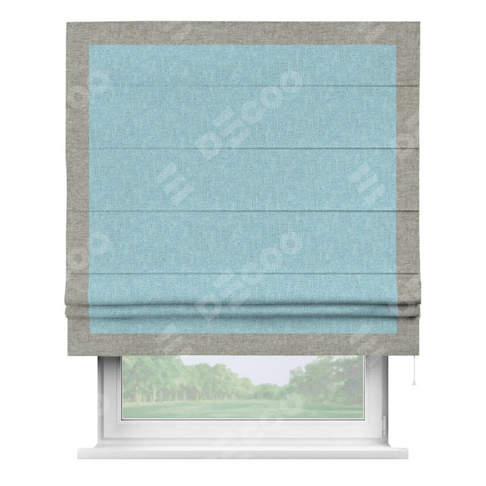 Римская штора производителя «Cortin», используется для проёма, пошита из ткани лён кашемир голубой, артикул 21616. Отделка шторы кантом «Чесс», ткань для канта используется из льна разной расцветки на выбор. Имеет универсальный механизм и подходит для монтажа: на потолок, на стену и в нишу.