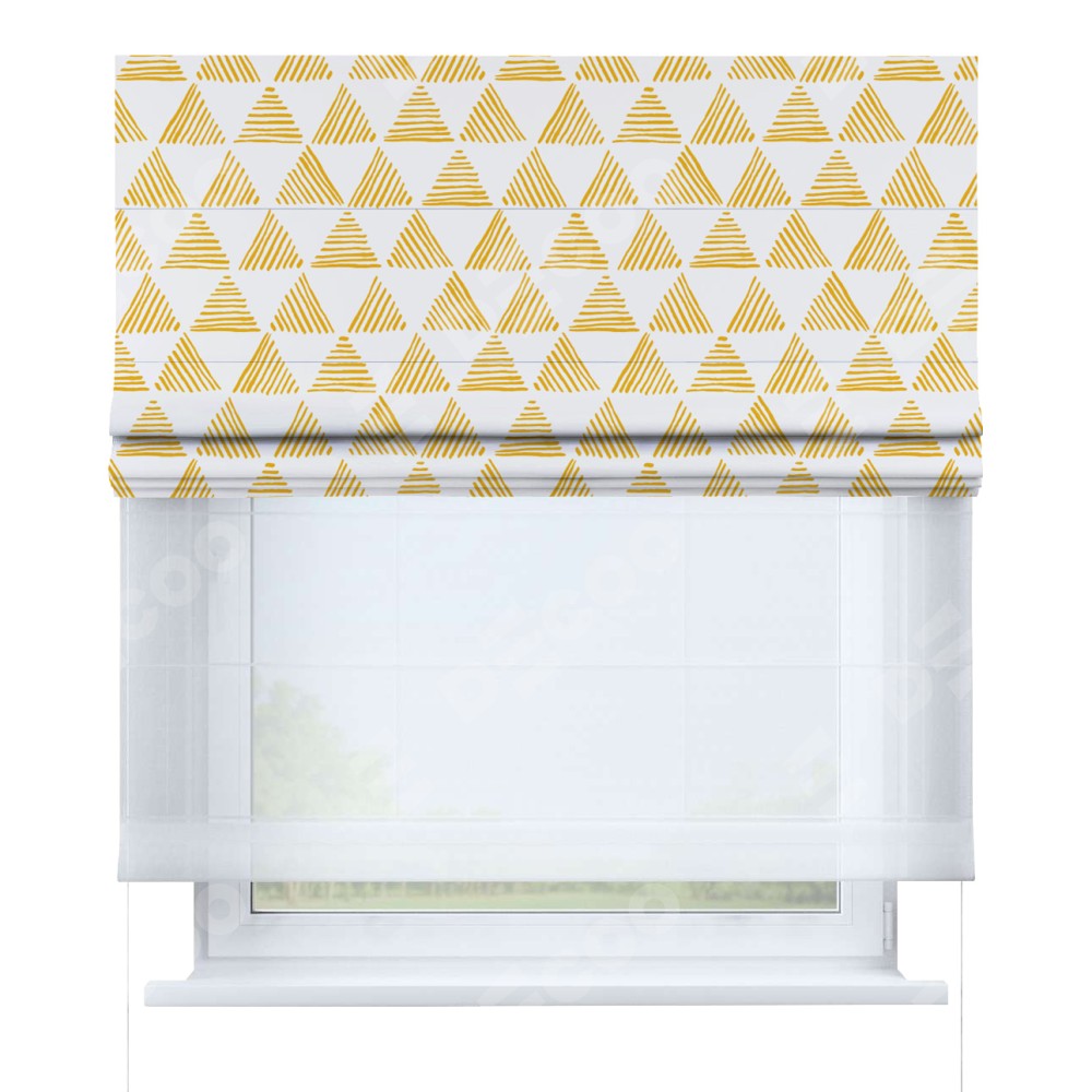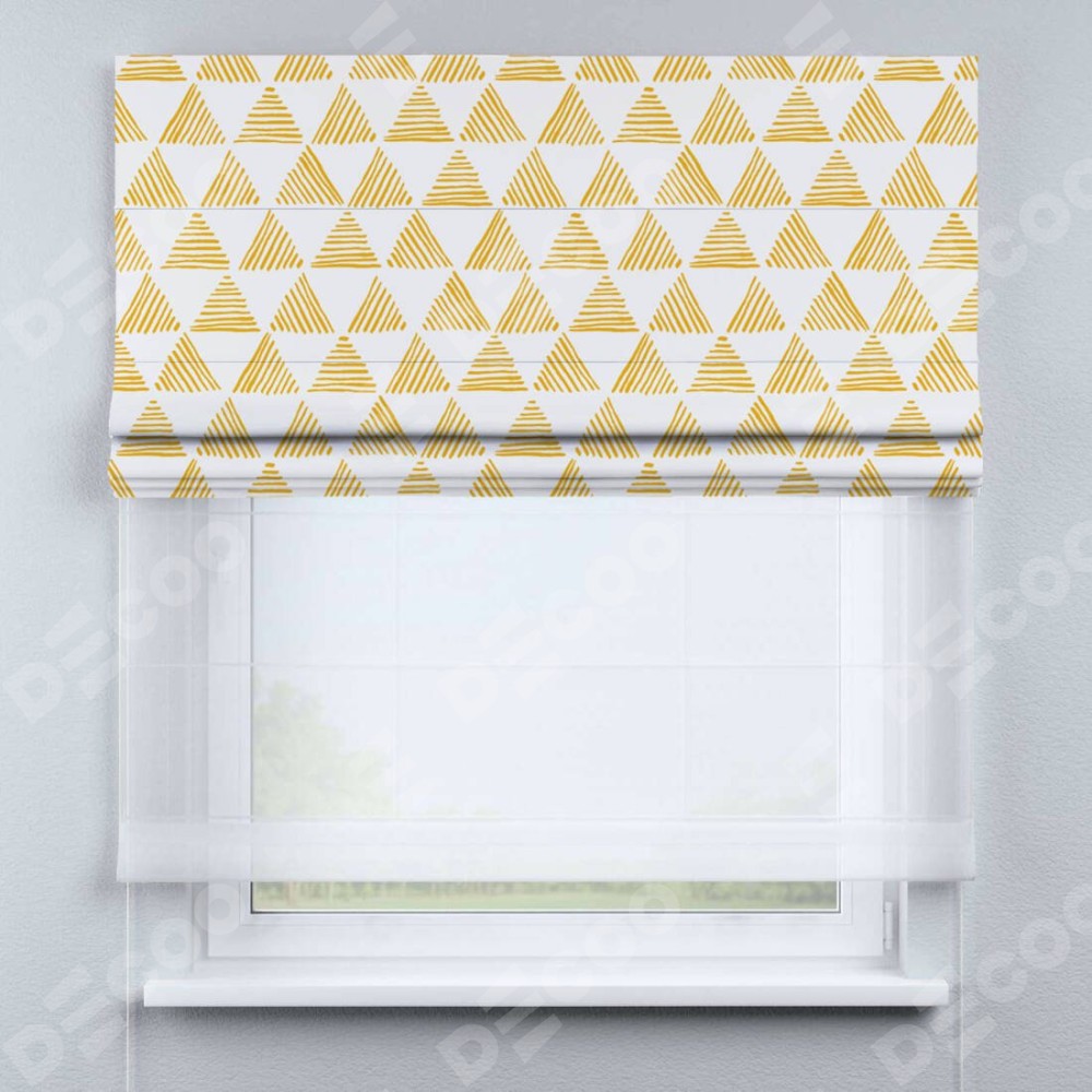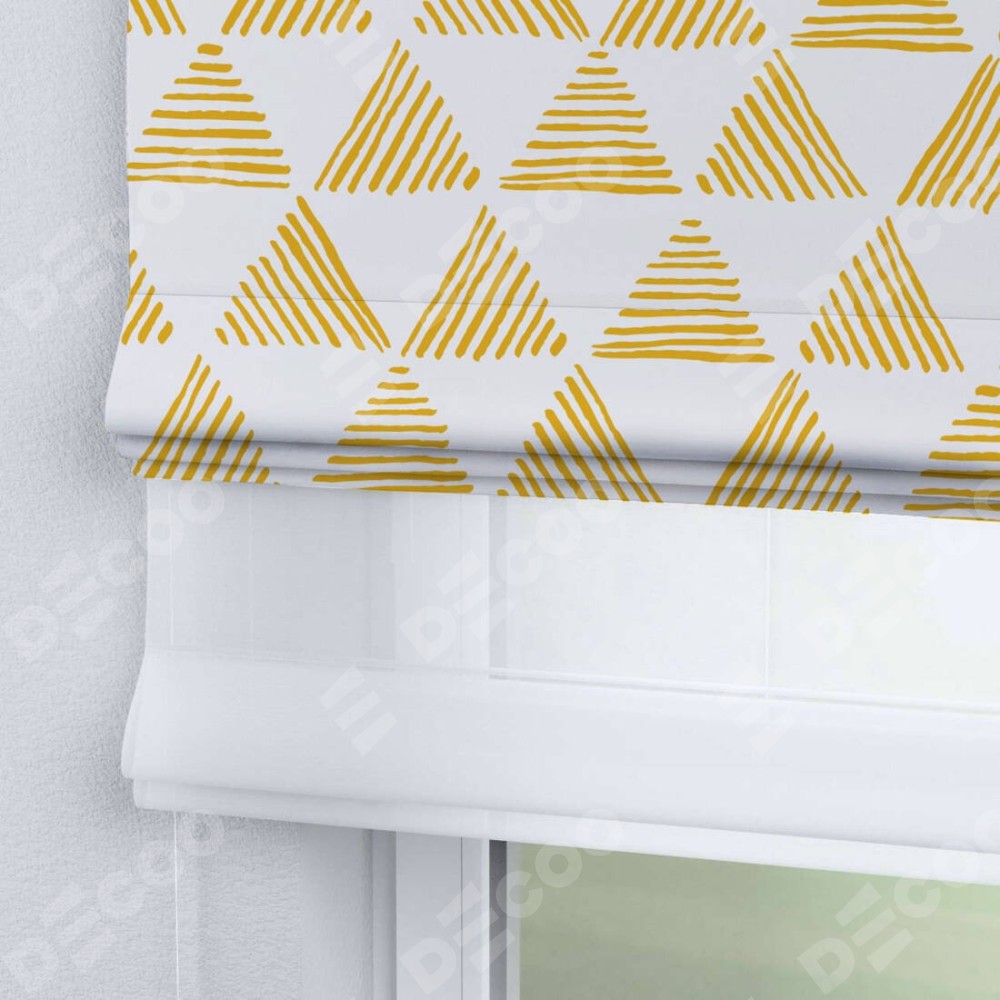 Римская штора день-ночь производителя «Cortin», используется для проёма, пошита из двух полотен, с лицевой блэкаут с нанесением сублимационной печати «Желтые треугольники», вторая ткань тюль (по стандарту комплектуется тюль белого цвета артикул V-01). Имеет универсальный механизм и подходит для монтажа: на потолок, на стену и в нишу.