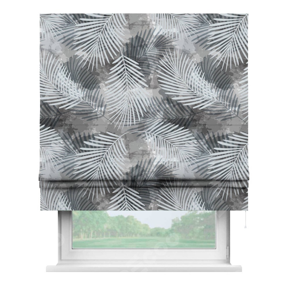 Римская штора производителя «Cortin», используется для проёма, пошита из ткани блэкаут с нанесением сублимационной печати «Листья в тени». Имеет универсальный механизм и подходит для монтажа: на потолок, на стену и в нишу.