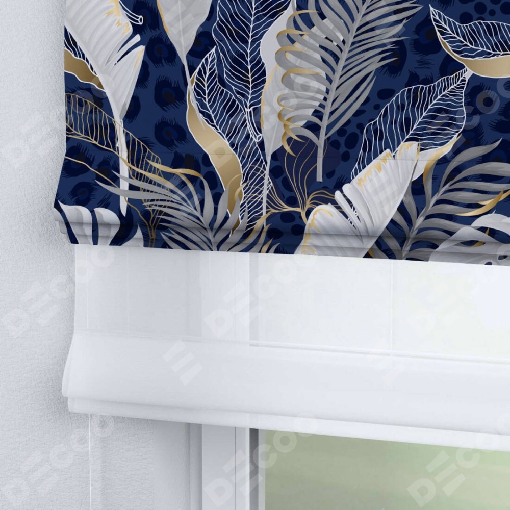 Римская штора день-ночь производителя «Cortin», используется для проёма, пошита из двух полотен, с лицевой блэкаут с нанесением сублимационной печати «Сине-золотые джунгли», вторая ткань тюль (по стандарту комплектуется тюль белого цвета артикул V-01). Имеет универсальный механизм и подходит для монтажа: на потолок, на стену и в нишу.