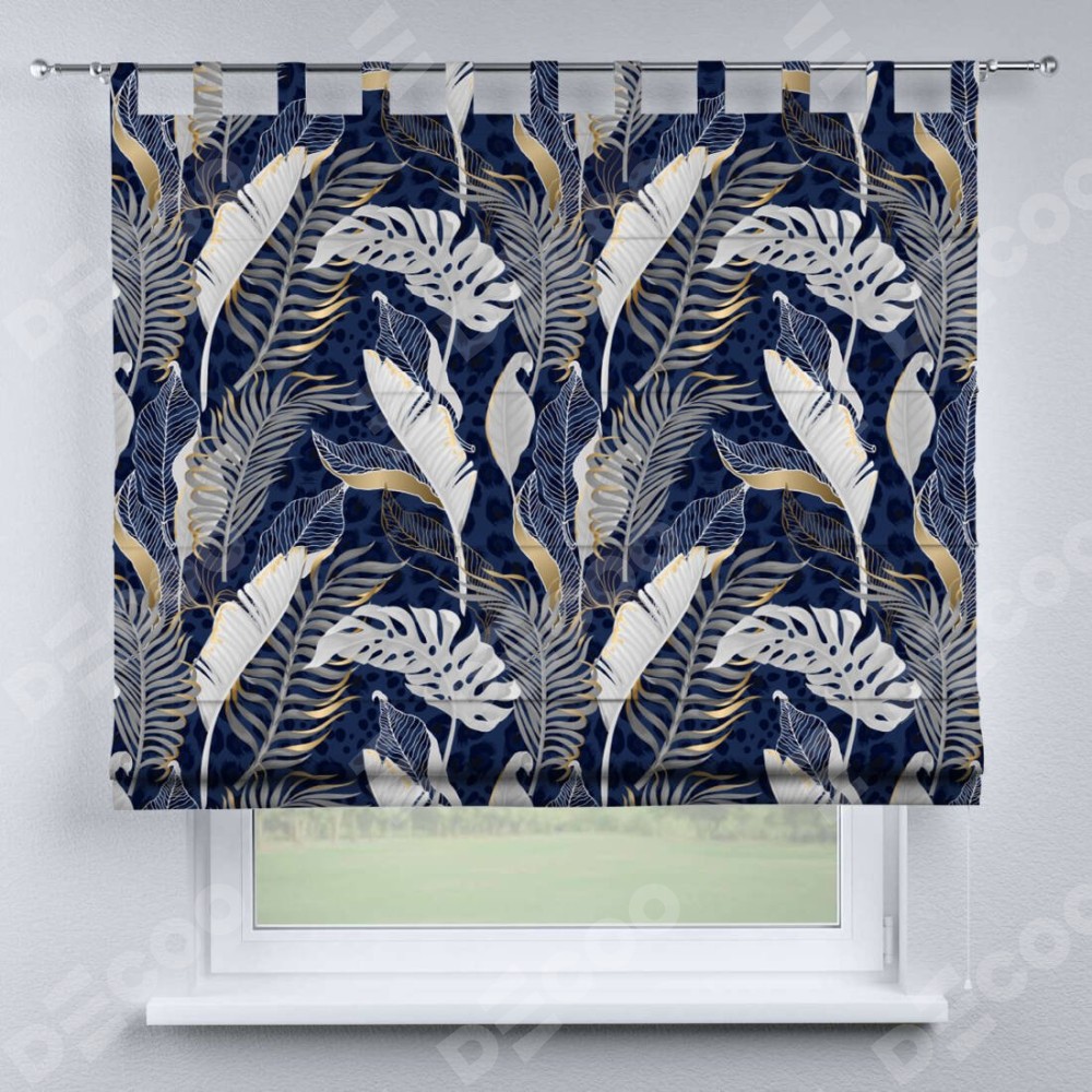Римская штора производителя «Cortin», используется для проёма, пошита из ткани блэкаут с нанесением сублимационной печати «Сине-золотые джунгли». Данная модель пошита на петлях, комплектуется на выбор круглым карнизом и подходит для монтажа на стену. Римская штора на петлях имеет простую систему регулировки высоты, отличительным преимуществом данной модели является простой способ монтажа. Достаточно повесить ее на трубу и штора готова!
