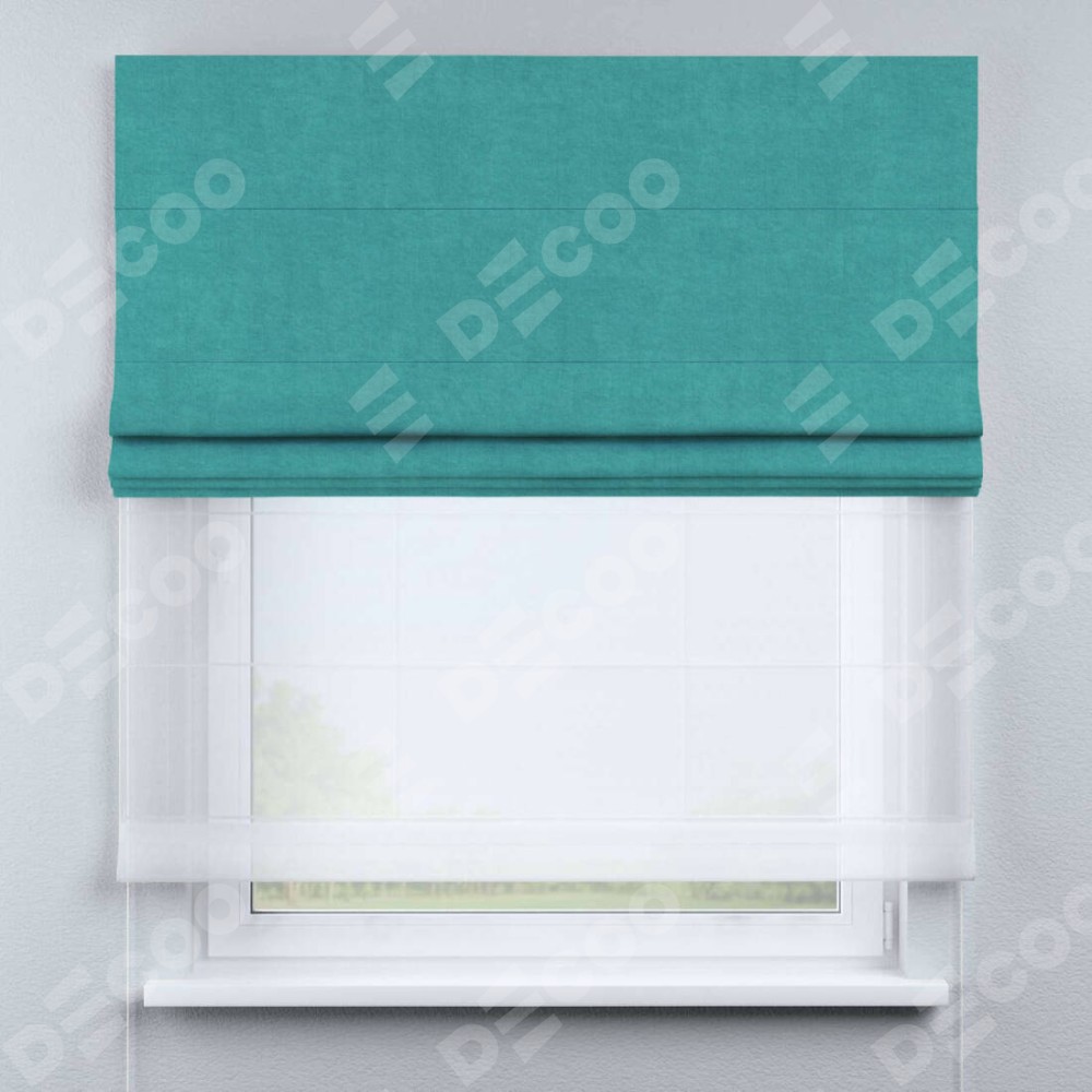 Римская штора день-ночь производителя «Cortin», используется для проёма, пошита из двух полотен, с лицевой стороны канвас бирюзовый артикул v-1048, вторая ткань тюль (по стандарту комплектуется тюль белого цвета артикул V-01). Имеет универсальный механизм и подходит для монтажа: на потолок, на стену и в нишу.