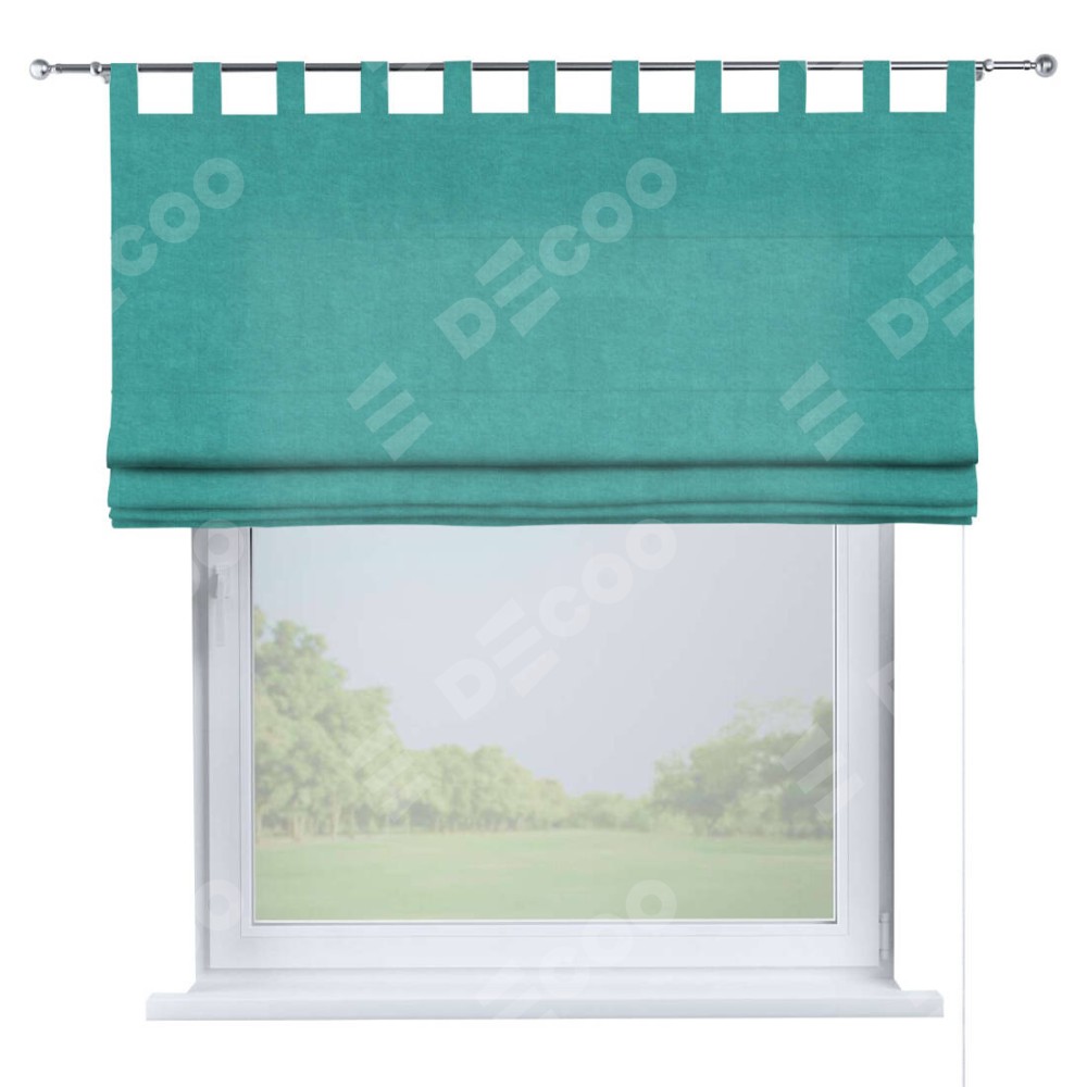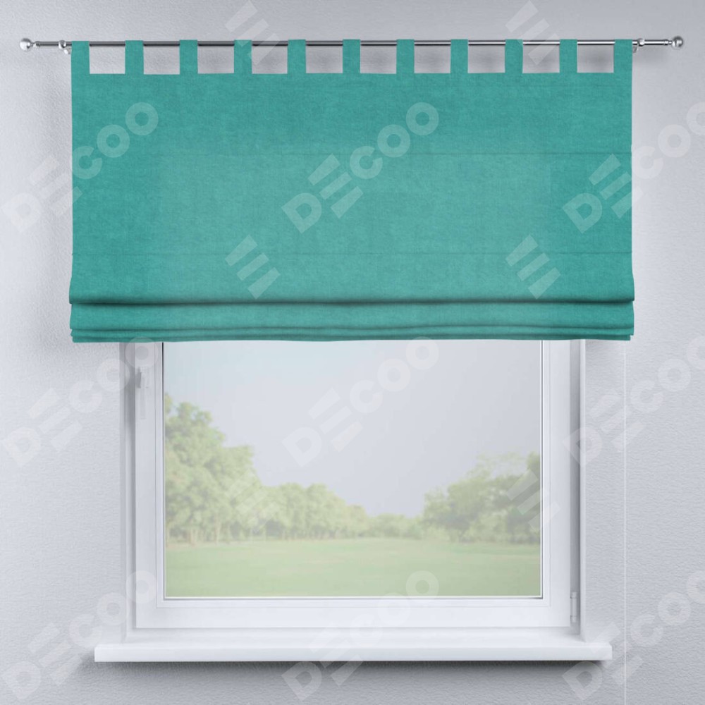 Римская штора производителя «Cortin», используется для проёма, пошита из ткани канвас бирюзовый, артикул ткани v-1048. Данная модель пошита на петлях, комплектуется на выбор круглым карнизом и подходит для монтажа на стену. Римская штора на петлях имеет простую систему регулировки высоты, отличительным преимуществом данной модели является простой способ монтажа. Достаточно повесить ее на трубу и штора готова!