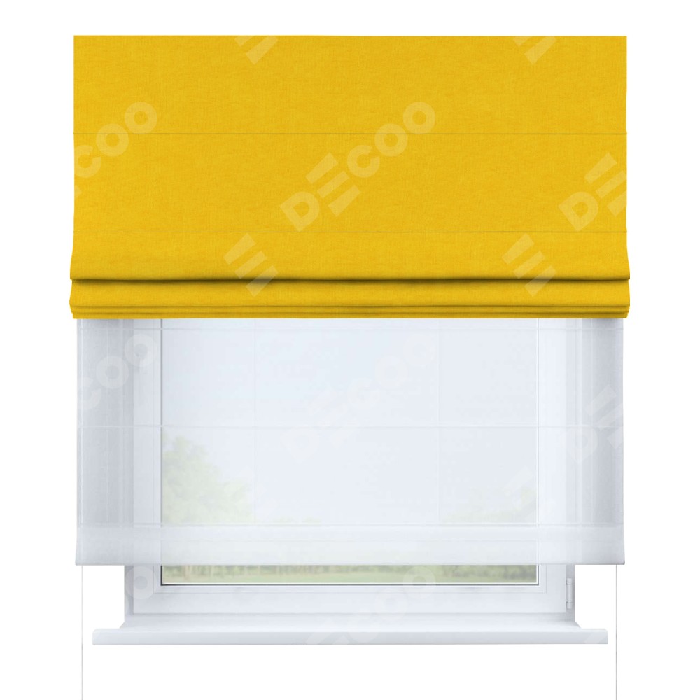 Римская штора день-ночь производителя «Cortin», используется для проёма, пошита из двух полотен, с лицевой стороны канвас желтый артикул v-344, вторая ткань тюль (по стандарту комплектуется тюль белого цвета артикул V-01). Имеет универсальный механизм и подходит для монтажа: на потолок, на стену и в нишу.