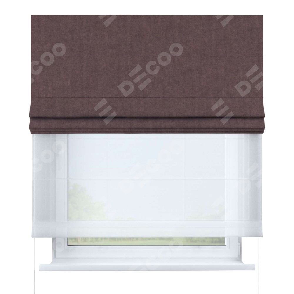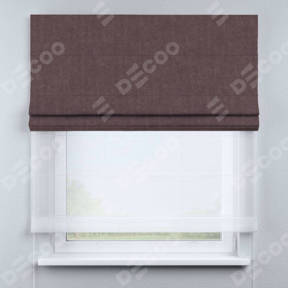 Римская штора день-ночь производителя «Cortin», используется для проёма, пошита из двух полотен, с лицевой стороны канвас махагон артикул v-37, вторая ткань тюль (по стандарту комплектуется тюль белого цвета артикул V-01). Имеет универсальный механизм и подходит для монтажа: на потолок, на стену и в нишу.