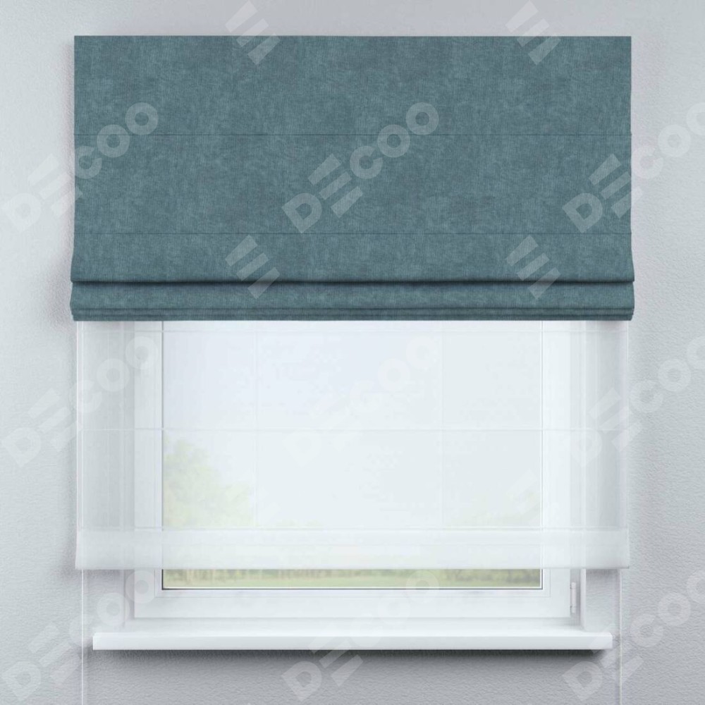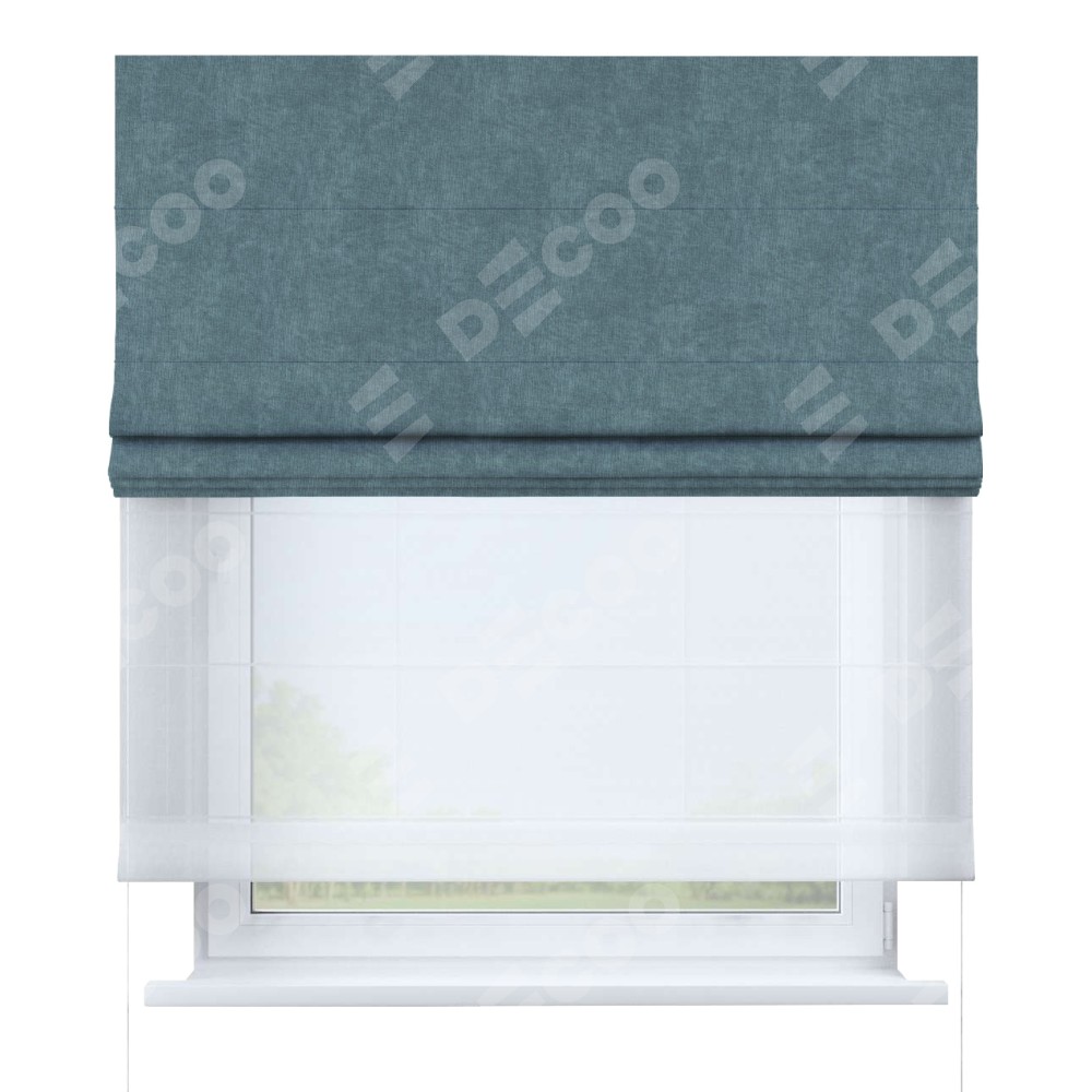 Римская штора день-ночь производителя «Cortin», используется для проёма, пошита из двух полотен, с лицевой стороны канвас серо-голубой артикул v-330, вторая ткань тюль (по стандарту комплектуется тюль белого цвета артикул V-01). Имеет универсальный механизм и подходит для монтажа: на потолок, на стену и в нишу.