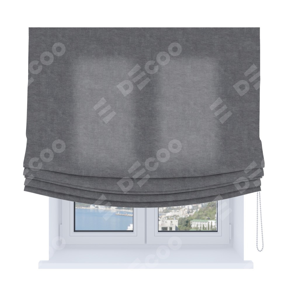 Римская штора Soft производителя «Cortin», используется для проёма, пошита из ткани канвас стальной, артикул ткани v-1082. Имеет универсальный механизм и подходит для монтажа: на потолок, на стену и в нишу. В отличие от стандартных римских штор, римская штора Soft не имеет горизонтальных вставок и нижнего отвеса. Это позволяет ткани произвольно драпироваться в свободные мягкие складки.