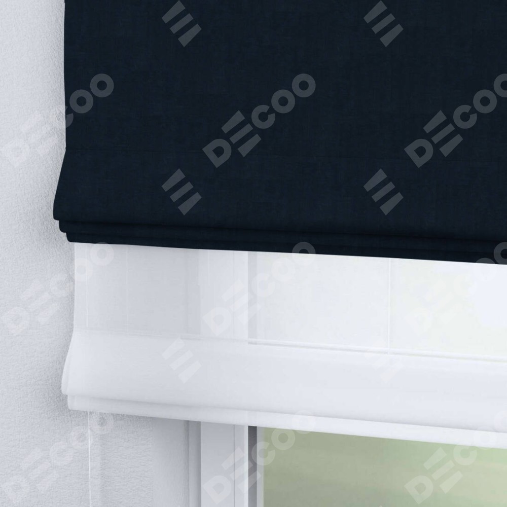 Римская штора день-ночь производителя «Cortin», используется для проёма, пошита из двух полотен, с лицевой стороны канвас тёмно-синий артикул v-206, вторая ткань тюль (по стандарту комплектуется тюль белого цвета артикул V-01). Имеет универсальный механизм и подходит для монтажа: на потолок, на стену и в нишу.