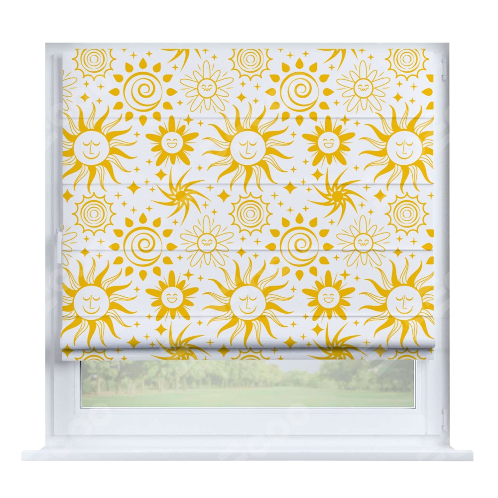 Римская штора производителя «Cortin», устанавливается на створку окна, пошита из ткани блэкаут с нанесением сублимационной печати «Солнышки». Штора шьётся по индивидуальным размерам, для данного типа римской шторы возможная ширина от 35 до 150 см., высота до 250 см.