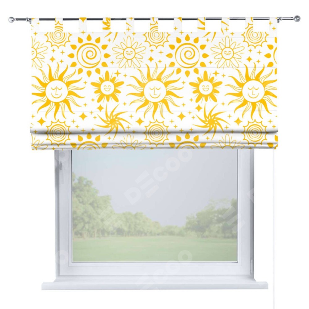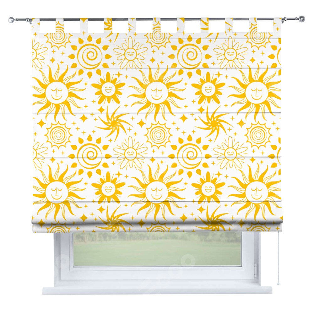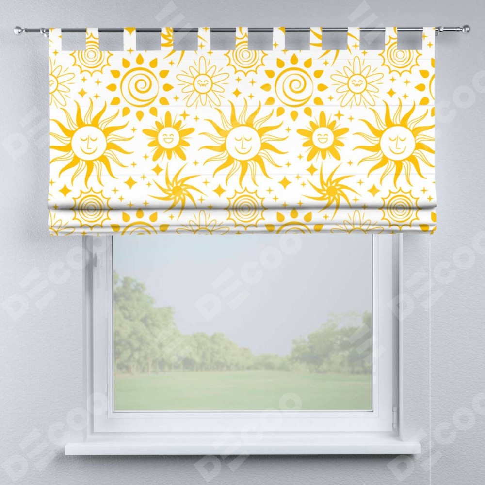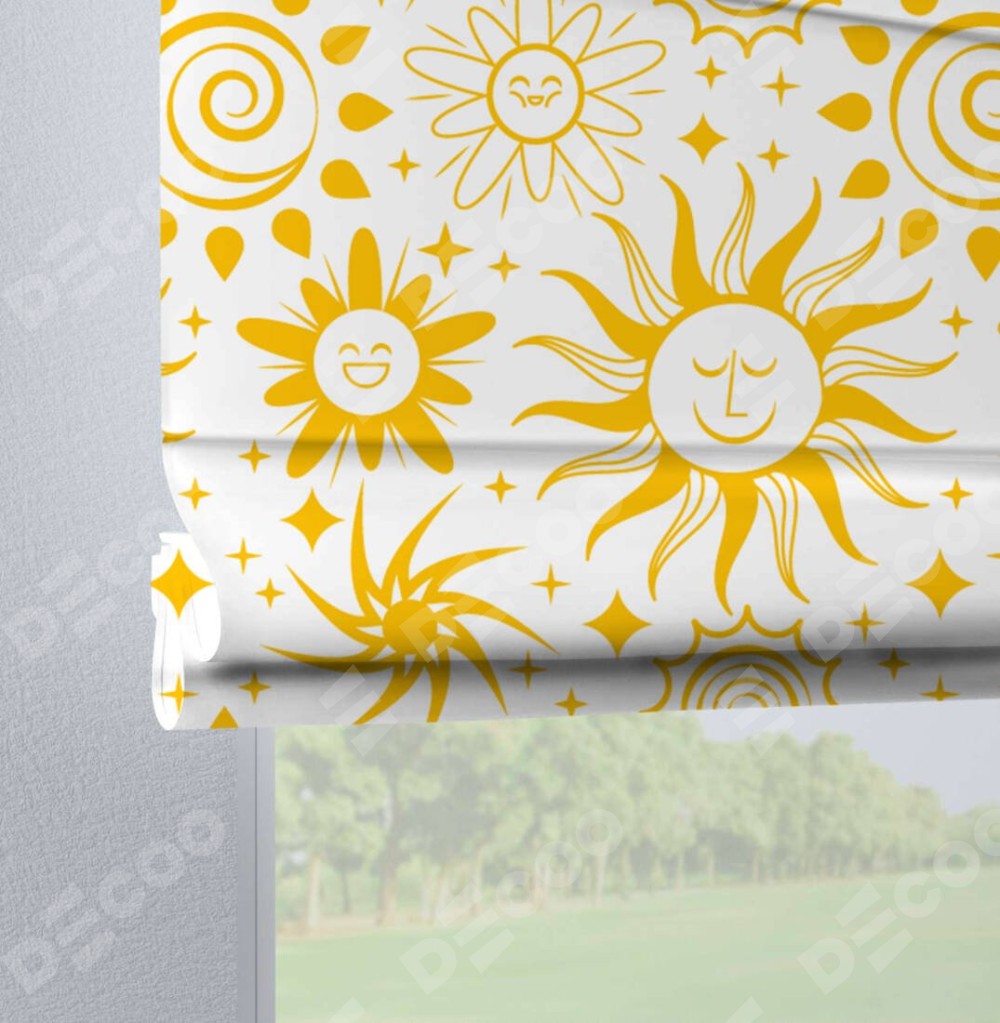 Римская штора производителя «Cortin», используется для проёма, пошита из ткани блэкаут с нанесением сублимационной печати «Солнышки». Данная модель пошита на петлях, комплектуется на выбор круглым карнизом и подходит для монтажа на стену. Римская штора на петлях имеет простую систему регулировки высоты, отличительным преимуществом данной модели является простой способ монтажа. Достаточно повесить ее на трубу и штора готова!