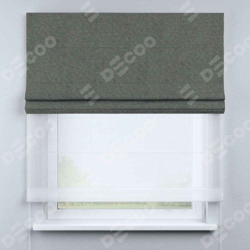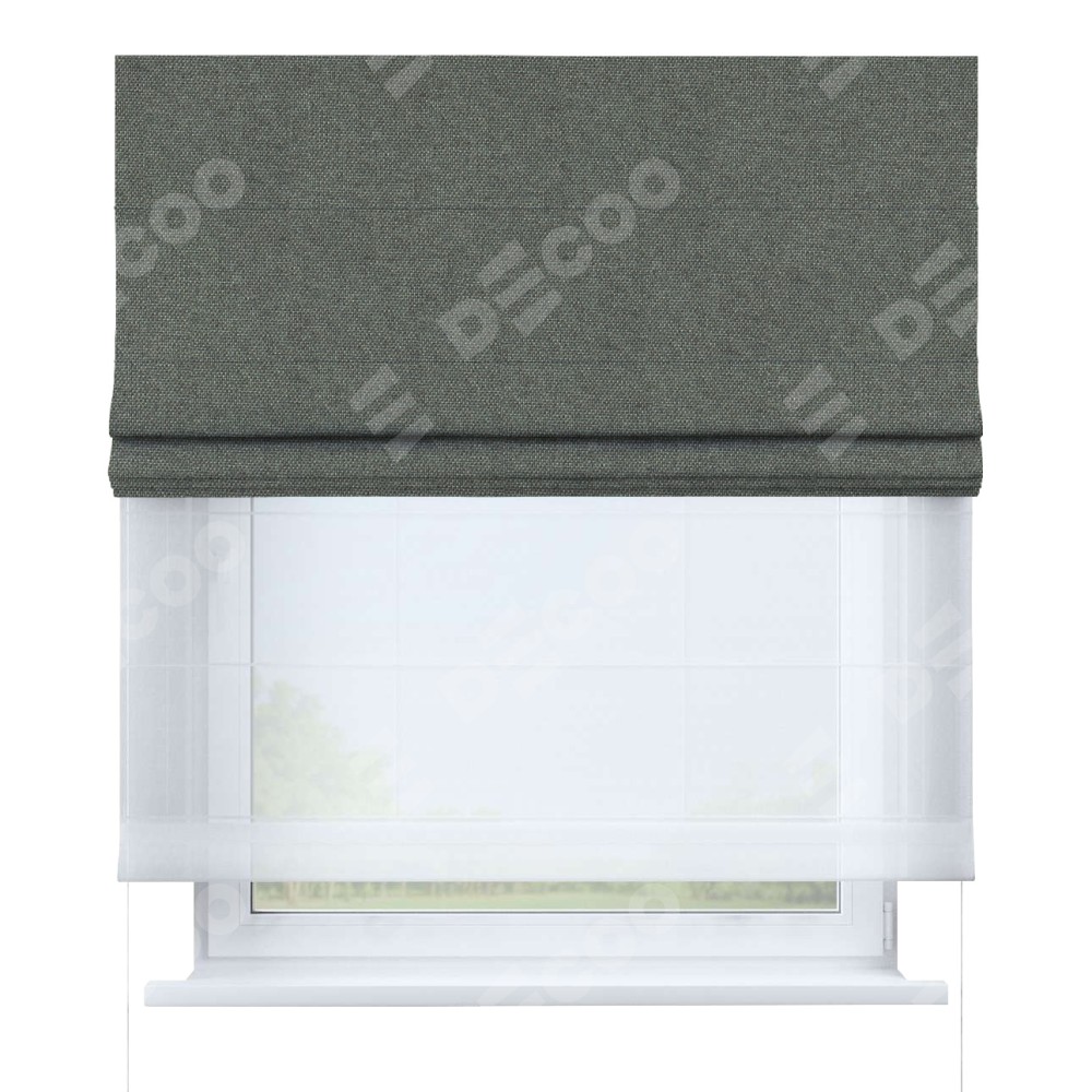 Римская штора день-ночь производителя «Cortin», используется для проёма, пошита из двух полотен, с лицевой стороны лён димаут тёмно-серый артикул 91011, вторая ткань тюль (по стандарту комплектуется тюль белого цвета артикул V-01). Имеет универсальный механизм и подходит для монтажа: на потолок, на стену и в нишу.