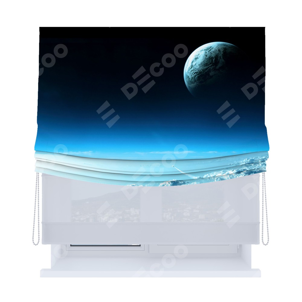 Римская штора день-ночь производителя «Cortin», используется для проёма, пошита из двух полотен, с лицевой блэкаут с нанесением сублимационной печати «Горизонты вселенной», вторая ткань тюль (по стандарту комплектуется тюль белого цвета артикул V-01). Имеет универсальный механизм и подходит для монтажа: на потолок, на стену и в нишу. Удобное управление каждой шторой отдельно.