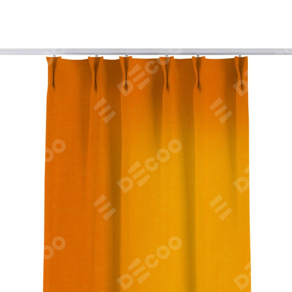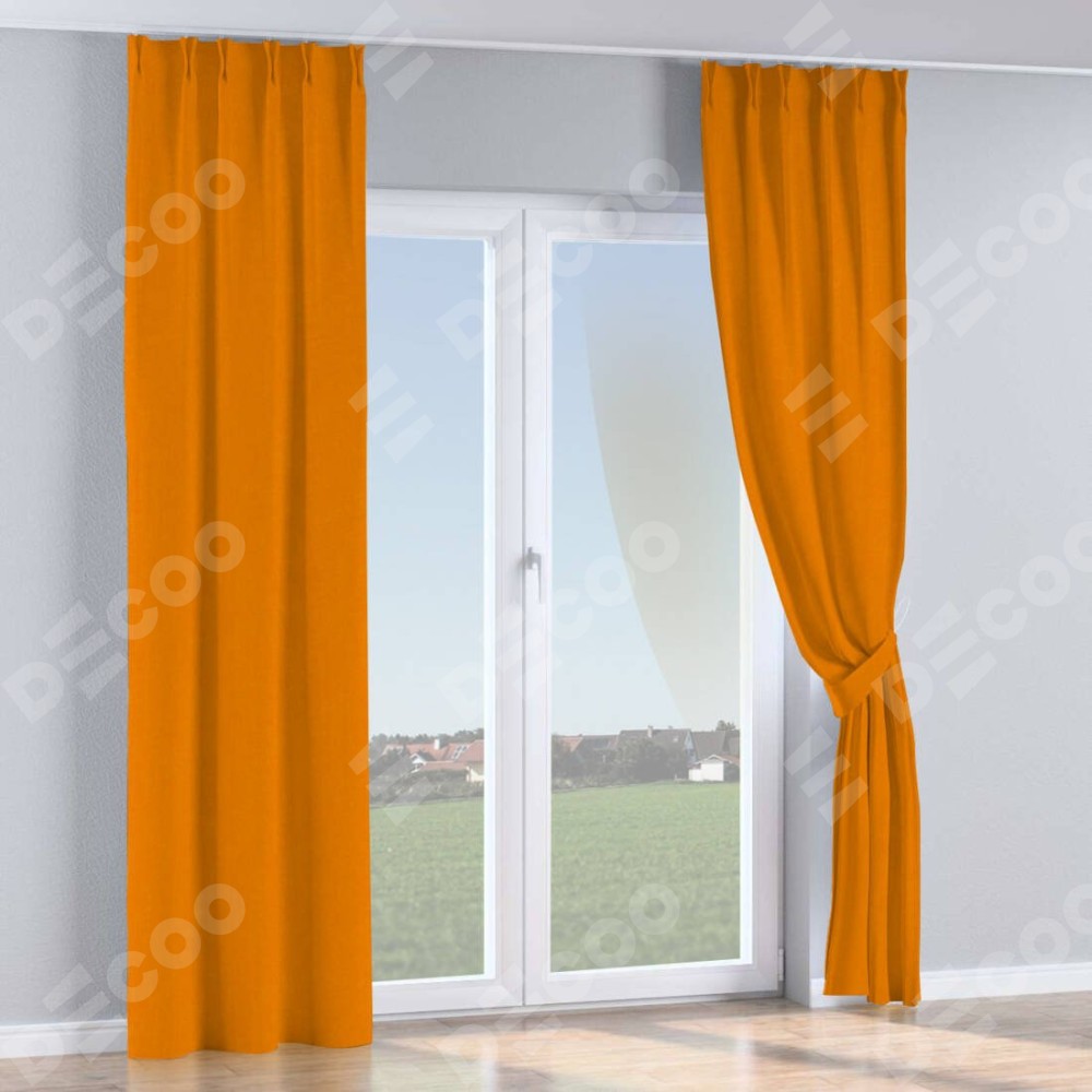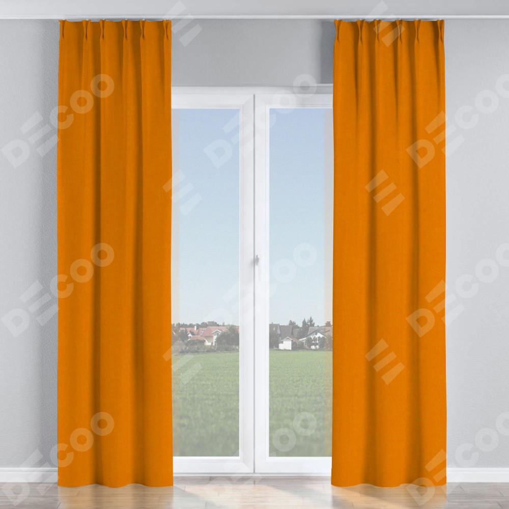 Комплект прямых штор, от производителя «Cortin», пошиты из ткани канвас оранжевый, артикул ткани v-106. С изнаночной стороны в верхней части штор пристрачивается шторная лента с декоративными складками «Кустик». Для создания элегантных складок прямые шторы шьются по стандарту с коэффициентом 1:2 (на 100 см. ширины проёма 200 см. ширины ткани).