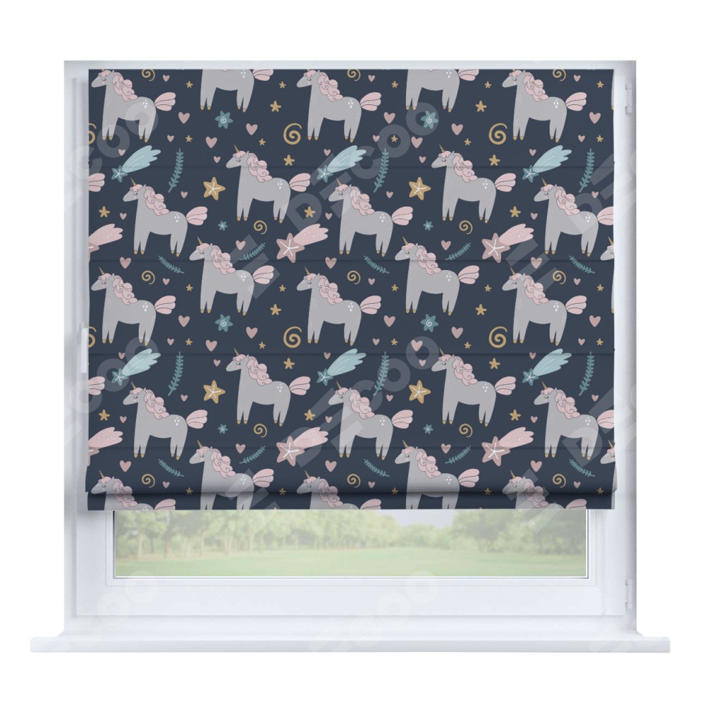 Римская штора производителя «Cortin», устанавливается на створку окна, пошита из ткани блэкаут с нанесением сублимационной печати «Милые единороги». Штора шьётся по индивидуальным размерам, для данного типа римской шторы возможная ширина от 35 до 150 см., высота до 250 см.
