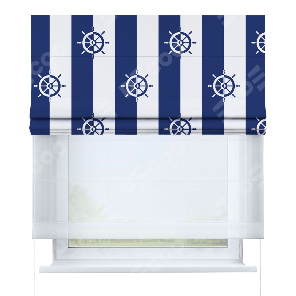 Римская штора день-ночь производителя «Cortin», используется для проёма, пошита из двух полотен, с лицевой блэкаут с нанесением сублимационной печати «Полоски и штурвалы», вторая ткань тюль (по стандарту комплектуется тюль белого цвета артикул V-01). Имеет универсальный механизм и подходит для монтажа: на потолок, на стену и в нишу.