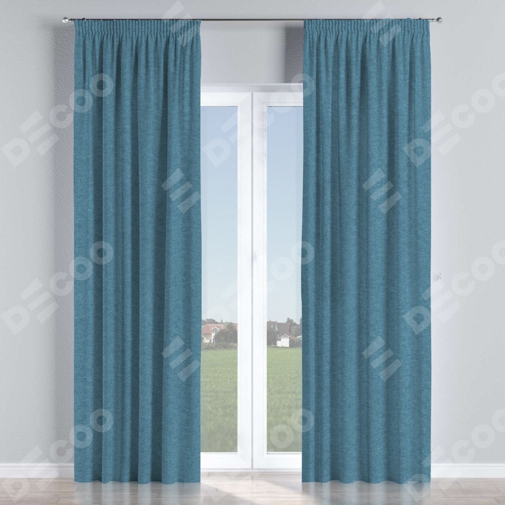 Комплект прямых штор, от производителя «Cortin», пошиты из ткани твид блэкаут светло-синий, артикул ткани 90935. С изнаночной стороны в верхней части штор пристрачивается шторная лента с декоративными складками «Карандаш». Для создания элегантных складок прямые шторы шьются по стандарту с коэффициентом 1:2 (на 100 см. ширины проёма 200 см. ширины ткани).