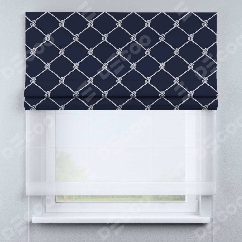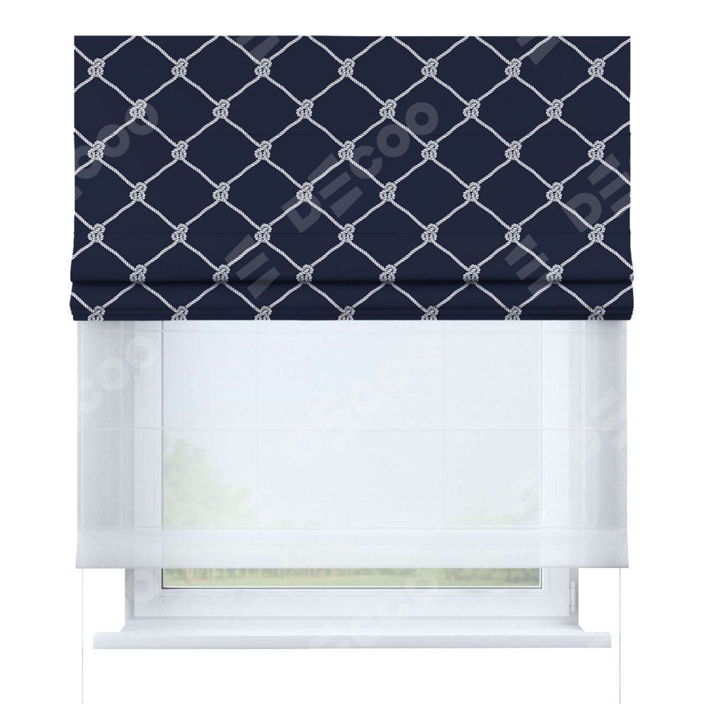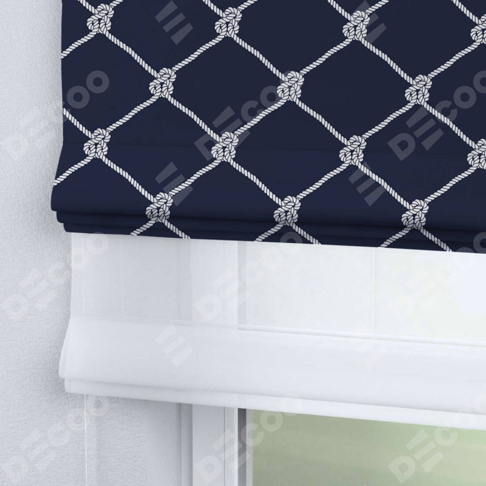 Римская штора день-ночь производителя «Cortin», используется для проёма, пошита из двух полотен, с лицевой блэкаут с нанесением сублимационной печати «Морские веревки», вторая ткань тюль (по стандарту комплектуется тюль белого цвета артикул V-01). Имеет универсальный механизм и подходит для монтажа: на потолок, на стену и в нишу.