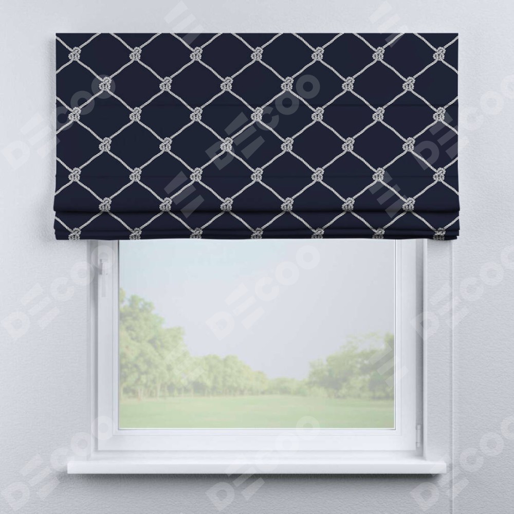 Римская штора производителя «Cortin», используется для проёма, пошита из ткани блэкаут с нанесением сублимационной печати «Морские веревки». Имеет универсальный механизм и подходит для монтажа: на потолок, на стену и в нишу.