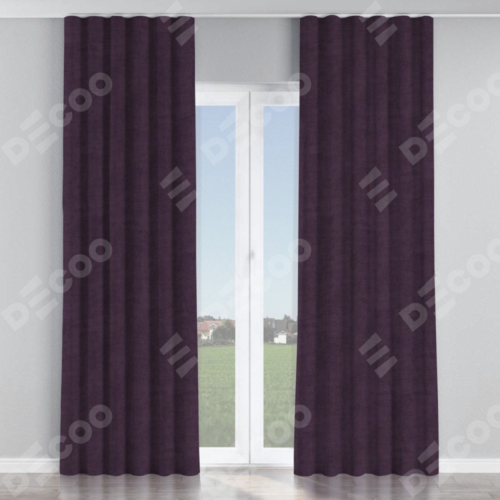 Комплект прямых штор, от производителя «Cortin», пошиты из ткани вельвет тёмно-фиолетовый, артикул ткани 72403. С изнаночной стороны в верхней части штор пристрачивается шторная лента с декоративными складками «Волна». Для создания элегантных складок прямые шторы шьются по стандарту с коэффициентом 1:2 (на 100 см. ширины проёма 200 см. ширины ткани).