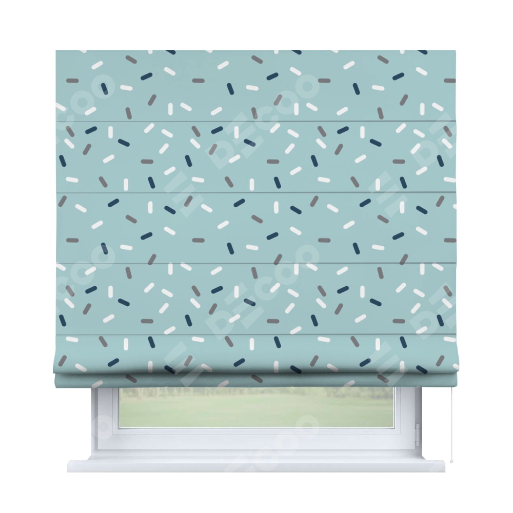 Римская штора производителя «Cortin», используется для проёма, пошита из ткани блэкаут с нанесением сублимационной печати «Короткие линии». Имеет универсальный механизм и подходит для монтажа: на потолок, на стену и в нишу.