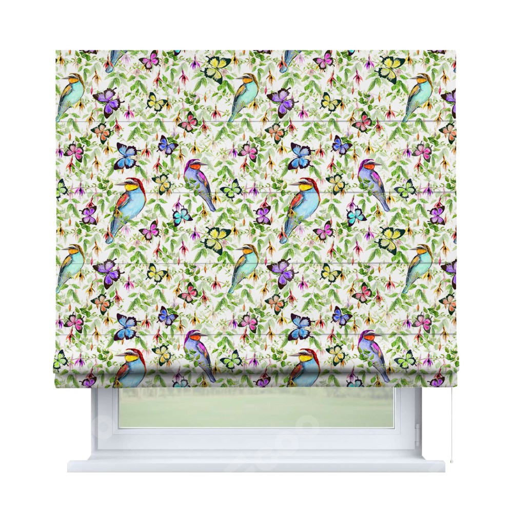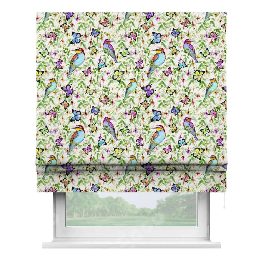 Римская штора производителя «Cortin», используется для проёма, пошита из ткани блэкаут с нанесением сублимационной печати «Тропические птицы». Имеет универсальный механизм и подходит для монтажа: на потолок, на стену и в нишу.