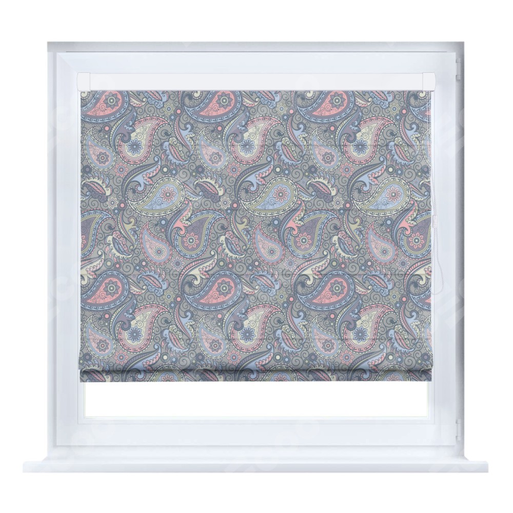 Римская штора кассетного типа, производителя «Cortin», устанавливается только на пластиковые окна и прилегает к стеклопакету, пошита из ткани блэкаут с нанесением сублимационной печати «Цветной пейсли».