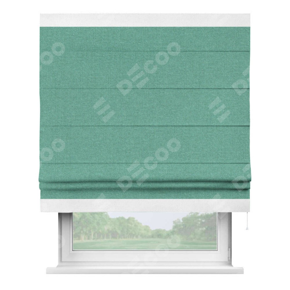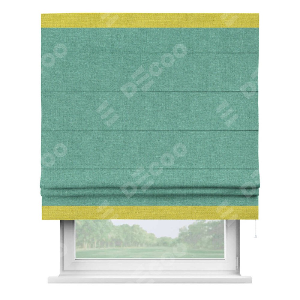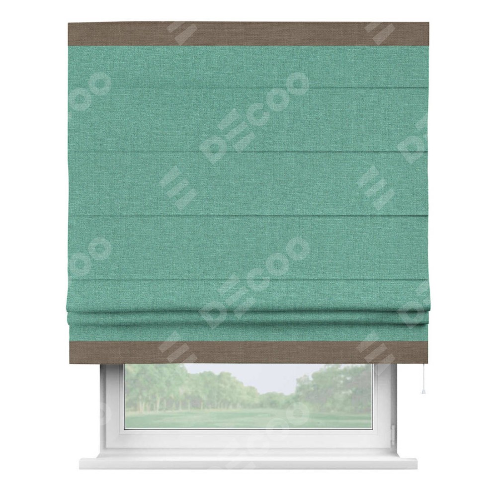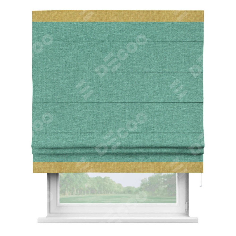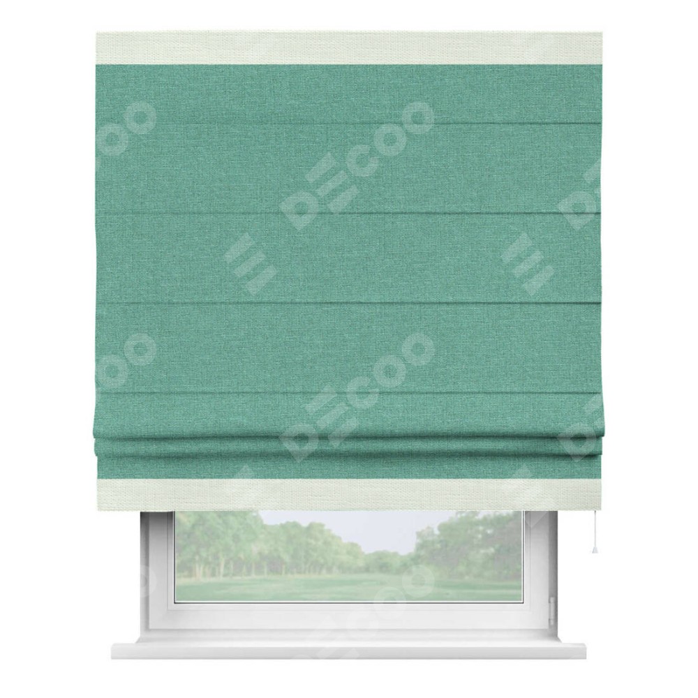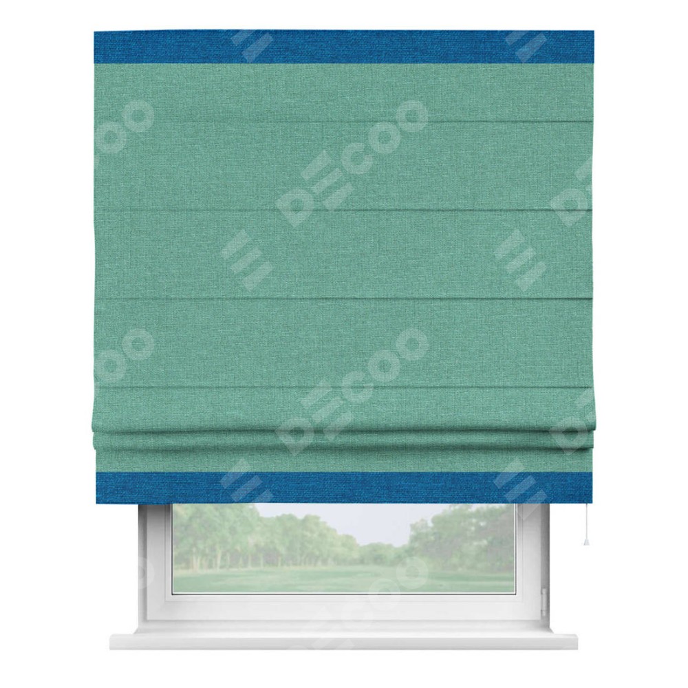 Римская штора производителя «Cortin», используется для проёма, пошита из ткани лён светло-бирюзовый, артикул 53435. Отделка шторы кантом «Горизонт», ткань для канта используется из льна разной расцветки на выбор. Имеет универсальный механизм и подходит для монтажа: на потолок, на стену и в нишу.