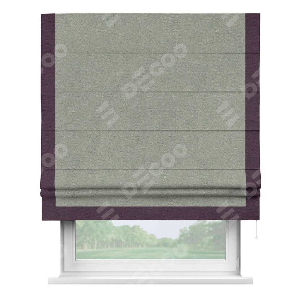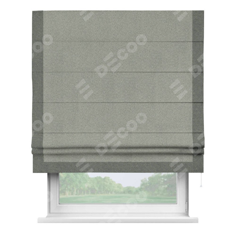 Римская штора производителя «Cortin», используется для проёма, пошита из ткани лён димаут серый, артикул 91009. Отделка шторы кантом «Виктория», ткань для канта используется из льна димаут разной расцветки на выбор. Имеет универсальный механизм и подходит для монтажа: на потолок, на стену и в нишу.