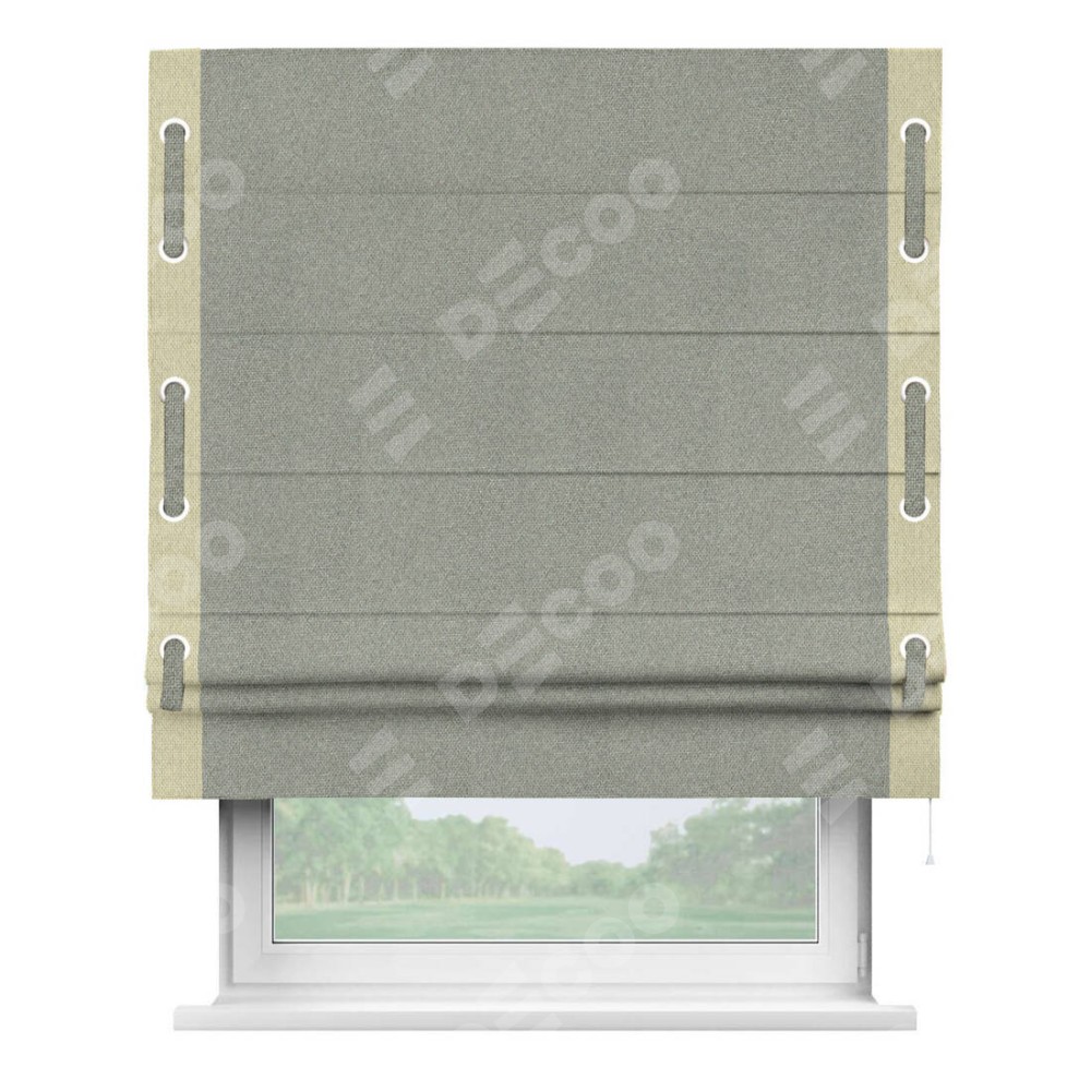 Римская штора «Кортин» для проема, лён димаут серый с кантом Стрим Дуо (люверсы с пояском)