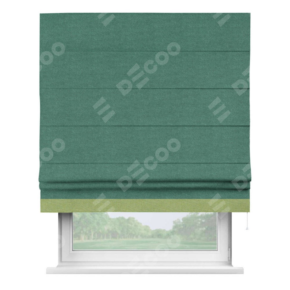 Римская штора производителя «Cortin», используется для проёма, пошита из ткани лён димаут светло-бирюзовый, артикул 91005. Отделка шторы кантом «Джестер», ткань для канта используется из льна димаут разной расцветки на выбор. Имеет универсальный механизм и подходит для монтажа: на потолок, на стену и в нишу.