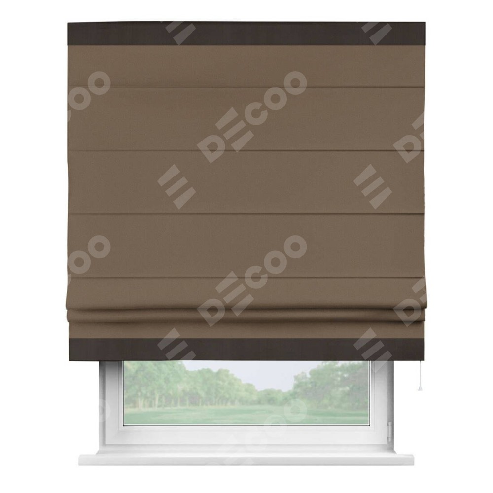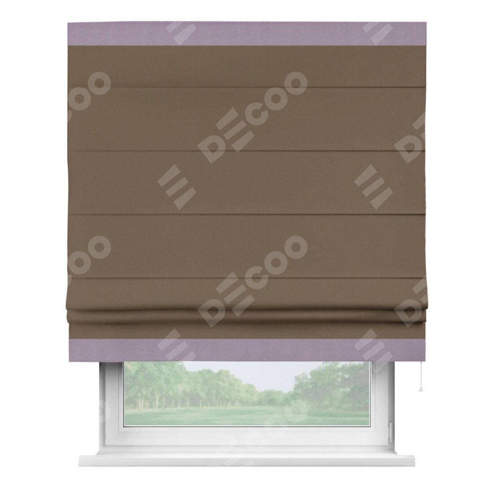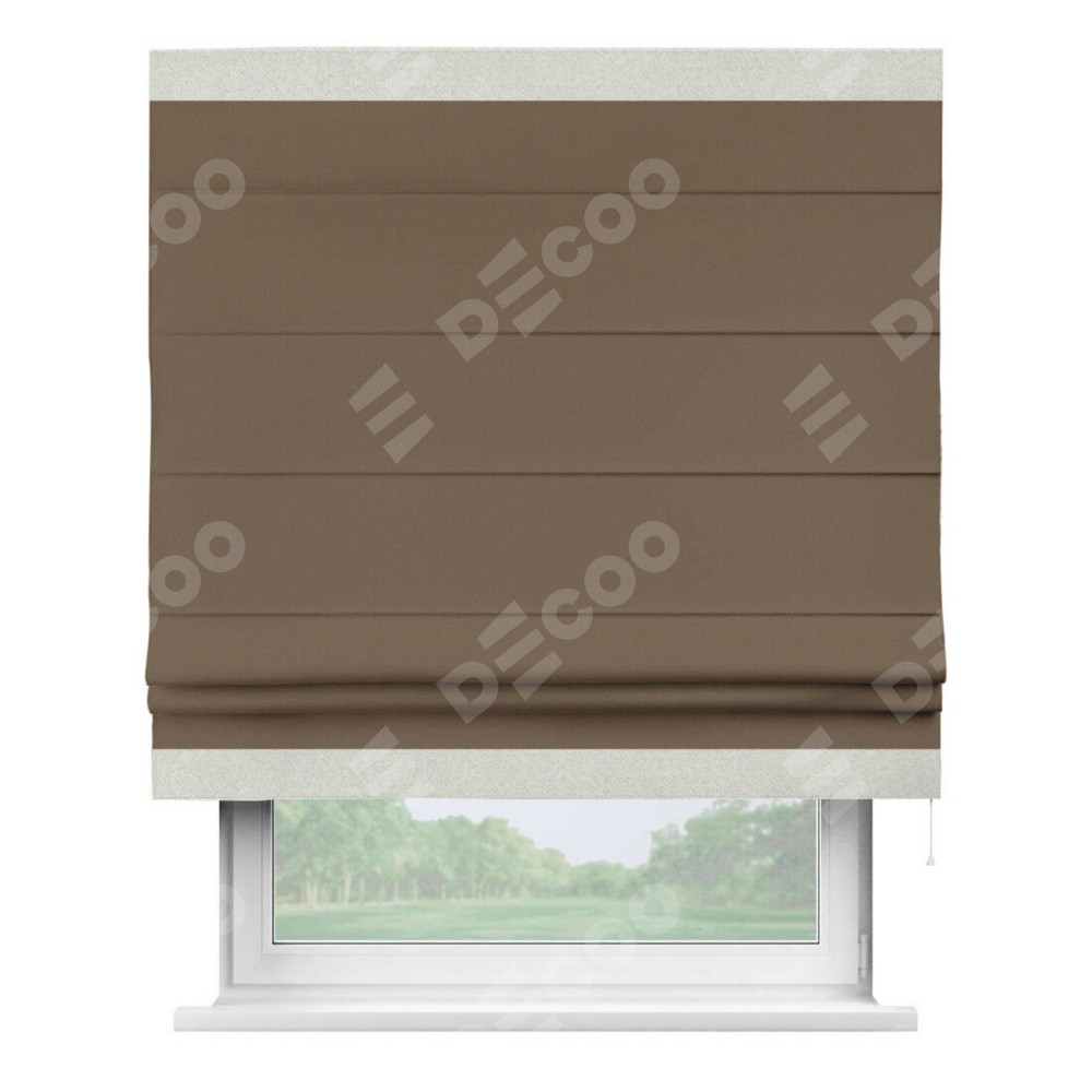 Римская штора производителя «Cortin», используется для проёма, пошита из ткани блэкаут однотонный коричневый, артикул ткани 91334. Отделка шторы кантом «Горизонт», ткань для канта используется из блэкаута однотонного разной расцветки на выбор. Имеет универсальный механизм и подходит для монтажа: на потолок, на стену и в нишу.