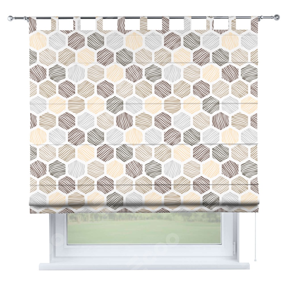 Римская штора производителя «Cortin», используется для проёма, пошита из ткани блэкаут с нанесением сублимационной печати «Мозаика соты». Данная модель пошита на петлях, комплектуется на выбор круглым карнизом и подходит для монтажа на стену. Римская штора на петлях имеет простую систему регулировки высоты, отличительным преимуществом данной модели является простой способ монтажа. Достаточно повесить ее на трубу и штора готова!