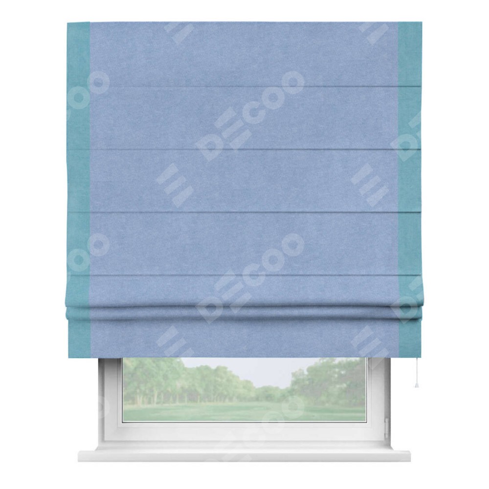 Римская штора производителя «Cortin», используется для проёма, пошита из ткани вельвет васильковый, артикул ткани 33799. Отделка шторы кантом «Стрим Дуо», ткань для канта используется из вельвета разной расцветки на выбор. Имеет универсальный механизм и подходит для монтажа: на потолок, на стену и в нишу.