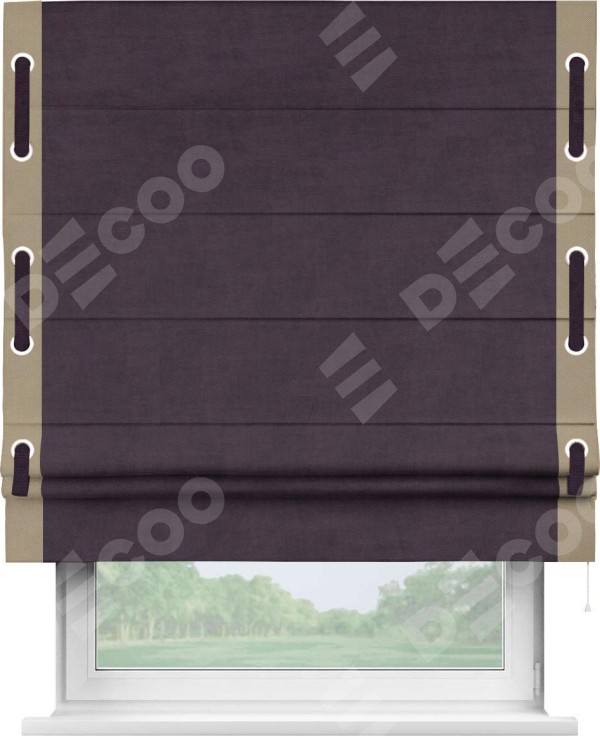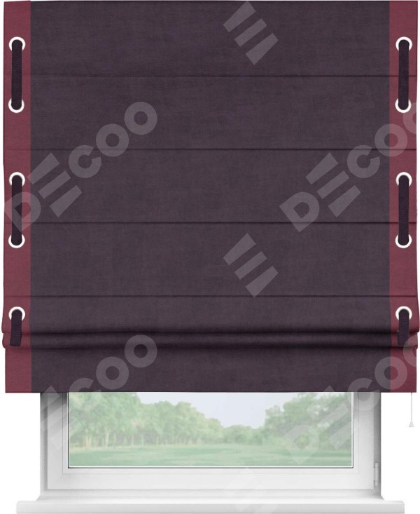 Римская штора «Кортин» для проема, вельвет тёмно-фиолетовый с кантом Стрим Дуо (люверсы с пояском)