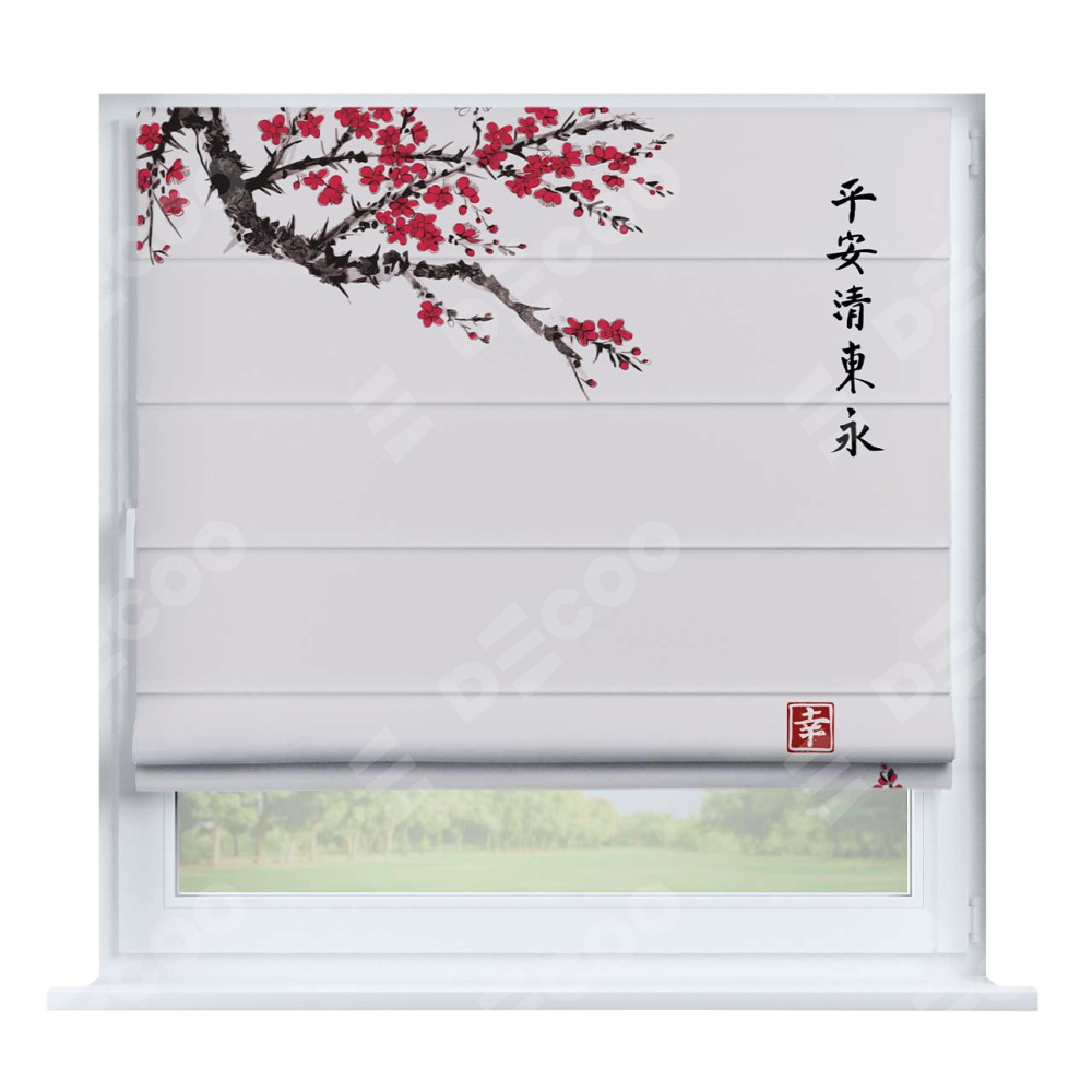 Римская штора производителя «Cortin», устанавливается на створку окна, пошита из ткани блэкаут с нанесением сублимационной печати «Цветущая сакура». Штора шьётся по индивидуальным размерам, для данного типа римской шторы возможная ширина от 35 до 150 см., высота до 250 см.