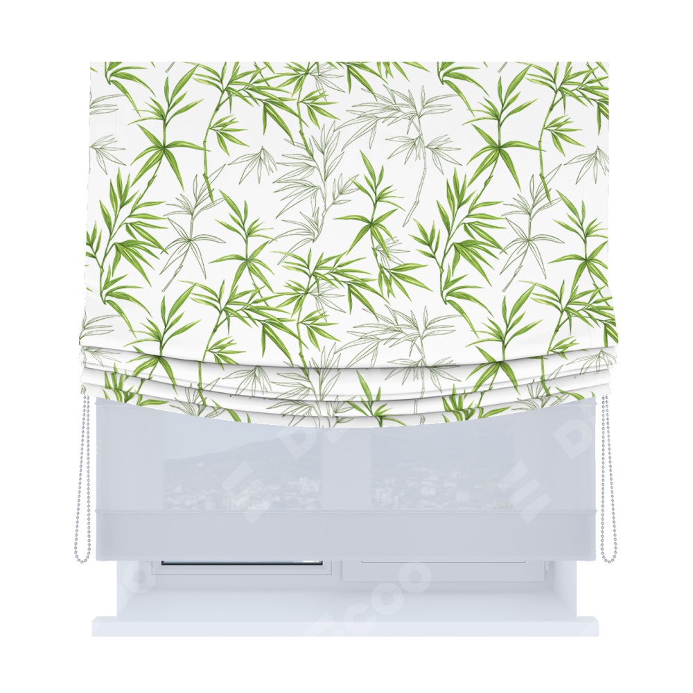 Римская штора день-ночь производителя «Cortin», используется для проёма, пошита из двух полотен, с лицевой блэкаут с нанесением сублимационной печати «Зелёный бамбук», вторая ткань тюль (по стандарту комплектуется тюль белого цвета артикул V-01). Имеет универсальный механизм и подходит для монтажа: на потолок, на стену и в нишу. Удобное управление каждой шторой отдельно.