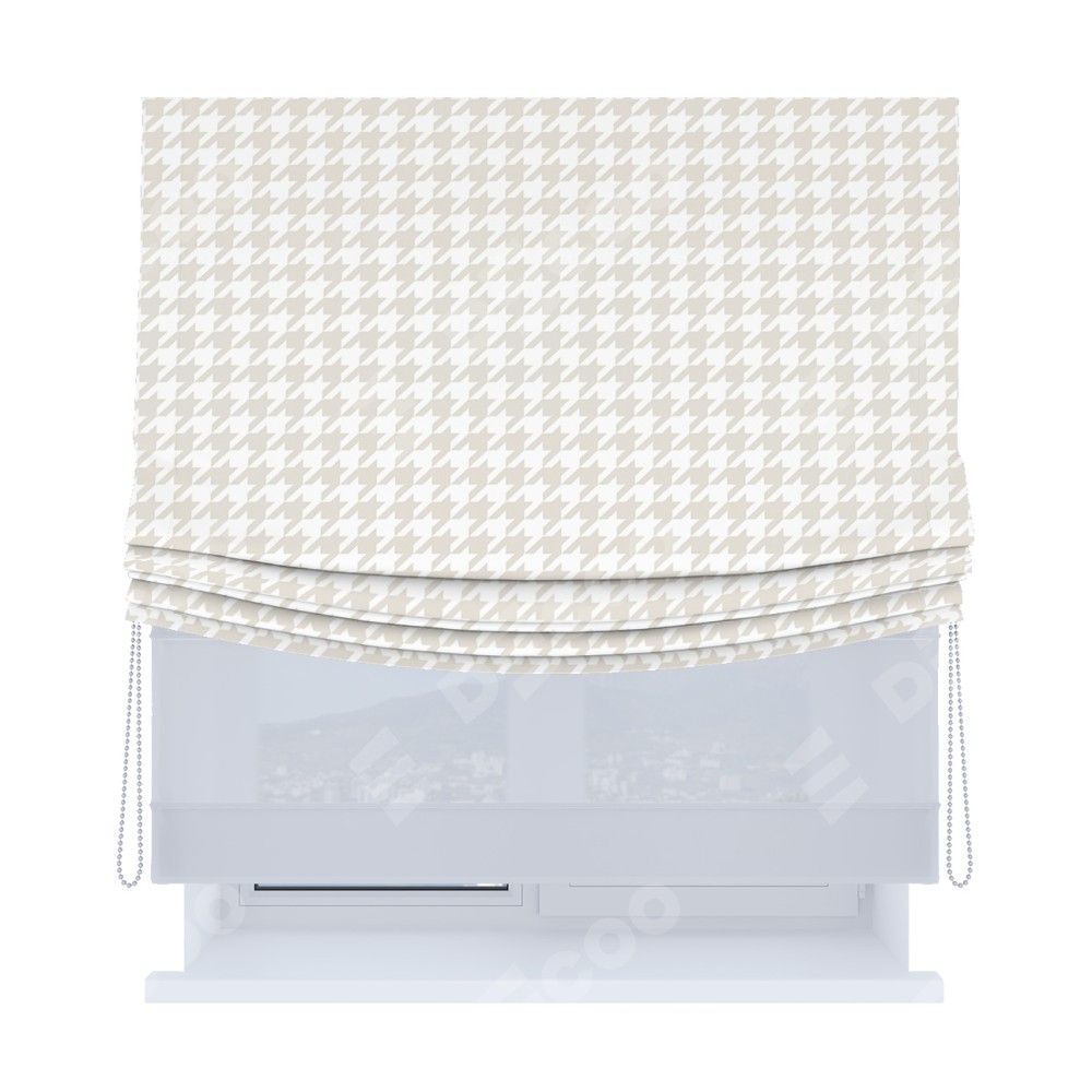 Римская штора день-ночь производителя «Cortin», используется для проёма, пошита из двух полотен, с лицевой блэкаут с нанесением сублимационной печати «Гусиные лапки» молочный», вторая ткань тюль (по стандарту комплектуется тюль белого цвета артикул V-01). Имеет универсальный механизм и подходит для монтажа: на потолок, на стену и в нишу. Удобное управление каждой шторой отдельно.