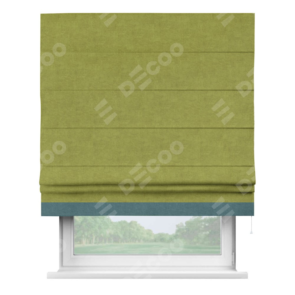 Римская штора производителя «Cortin», используется для проёма, пошита из ткани канвас зелёное яблоко, артикул ткани v-370. Отделка шторы кантом «Джестер» (ментоловый v-114), ткань для канта используется из канваса разной расцветки на выбор. Имеет универсальный механизм и подходит для монтажа: на потолок, на стену и в нишу.